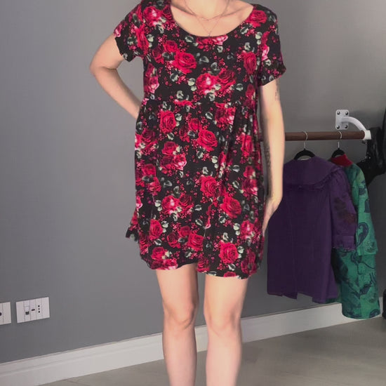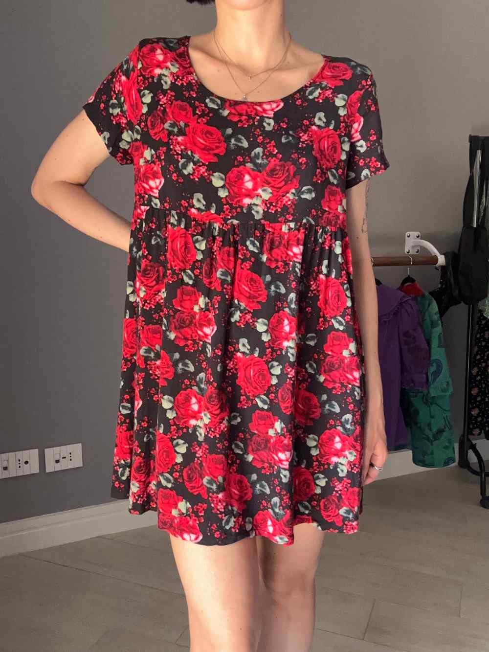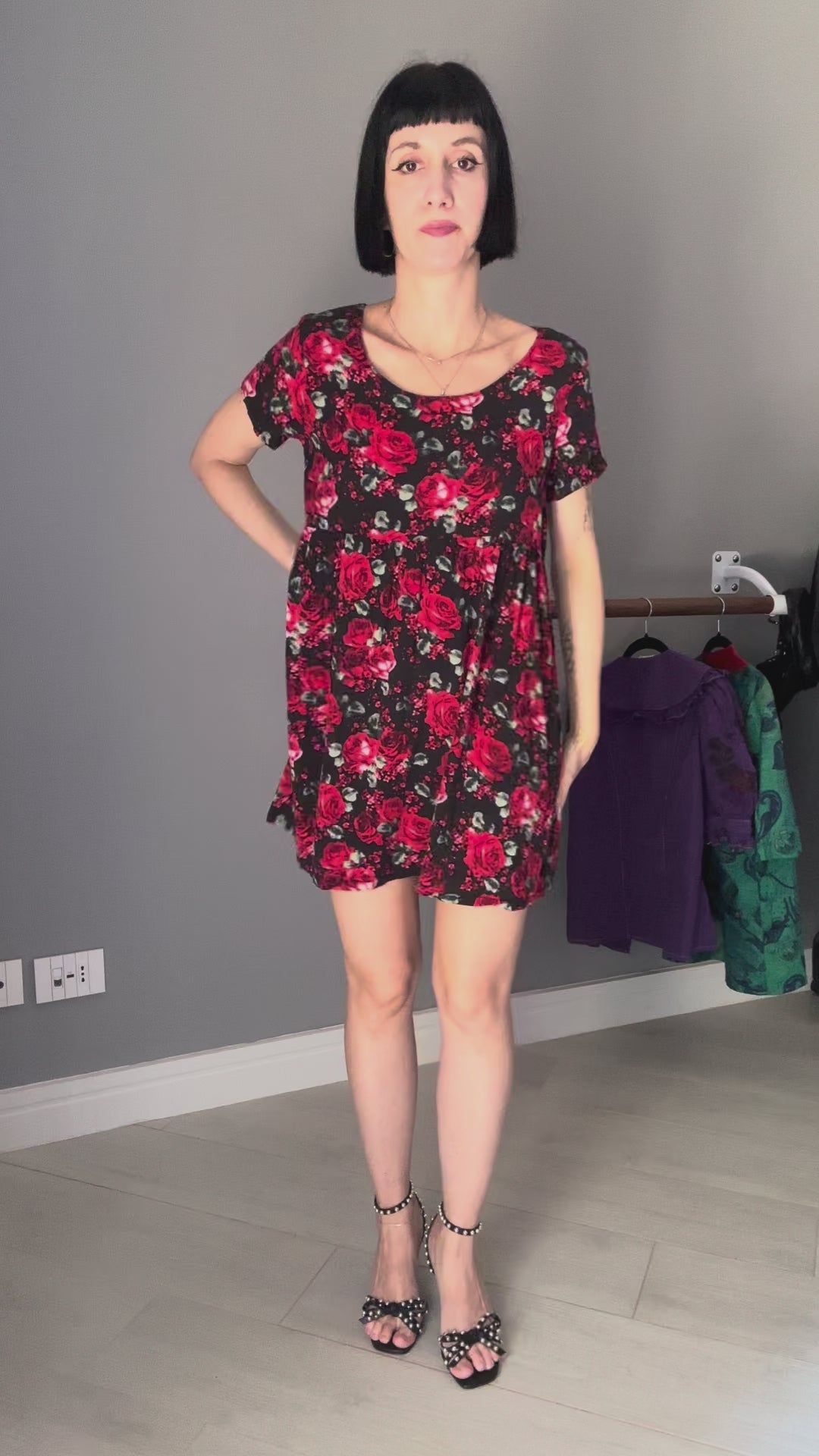 Abito a mezza manica, molto corto, con taglio stile impero, scende più largo. Fondo nero, bellissime rose rosso inteso.