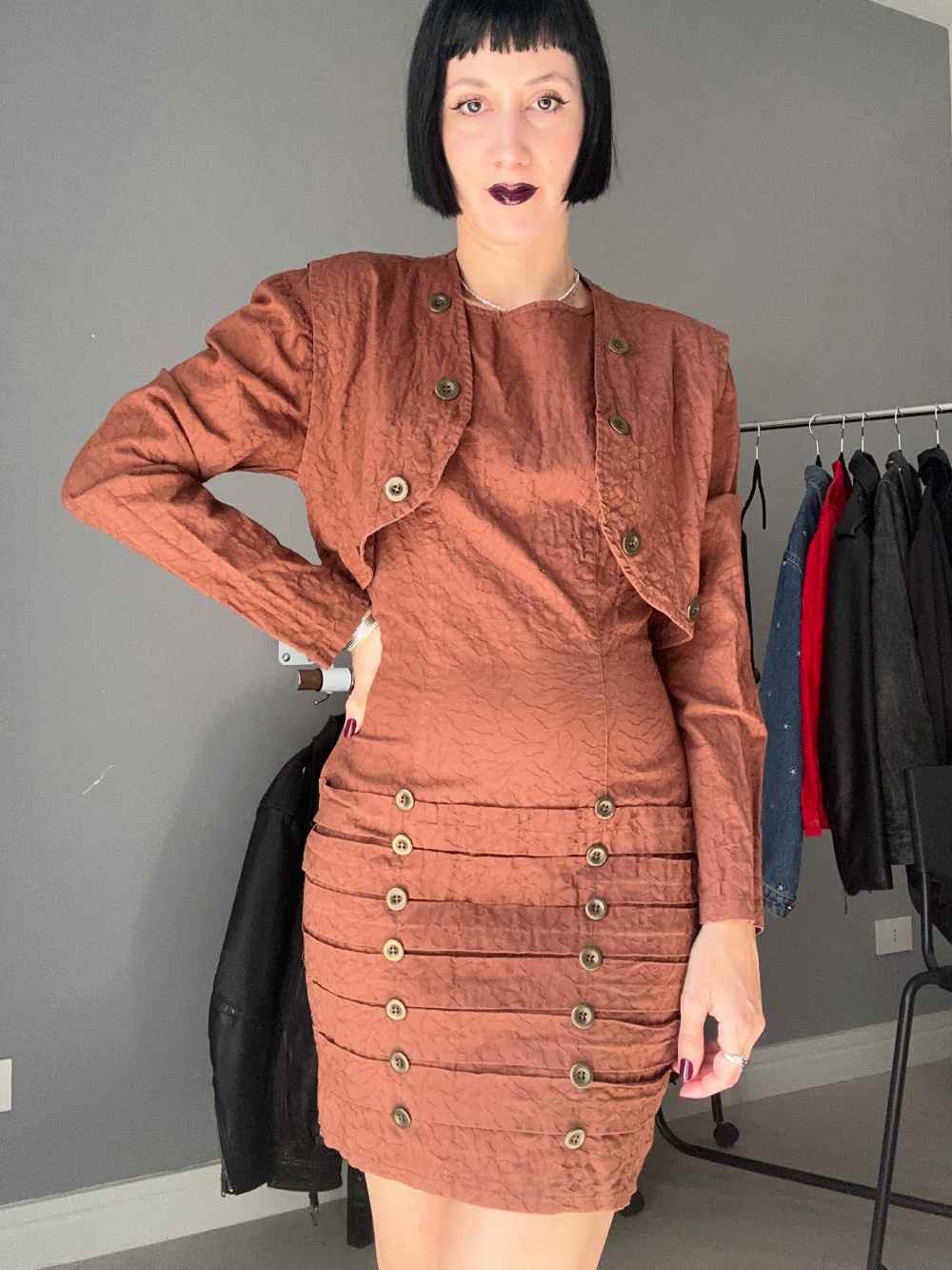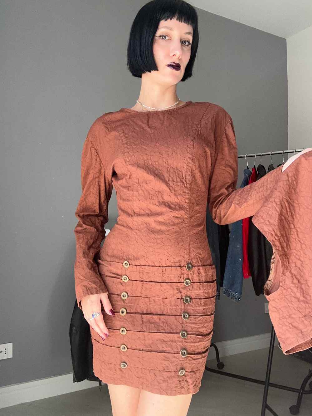 Abito marrone a manica lunga e scollo tondo, corto, con strisce in tessuto con bottoni, puramente decorative, che partono dai fianchi. Spalle leggermente a sbuffo. Ha un piccolo gilet con bottoni decorativi, corto e con estremità arrotondate.