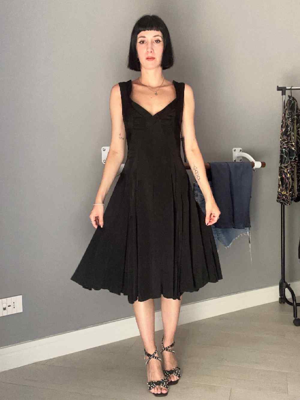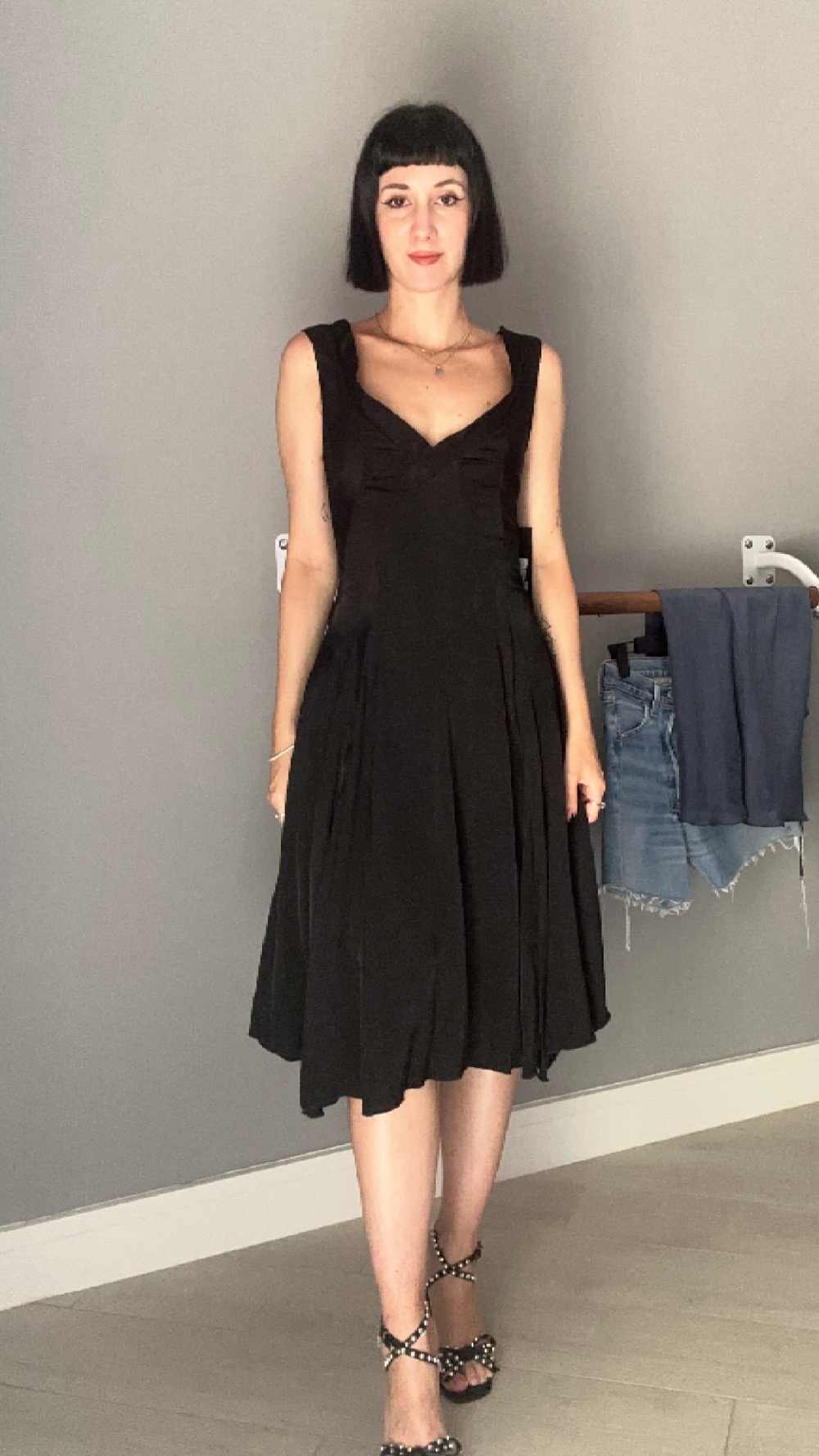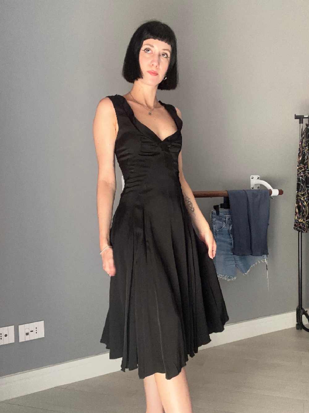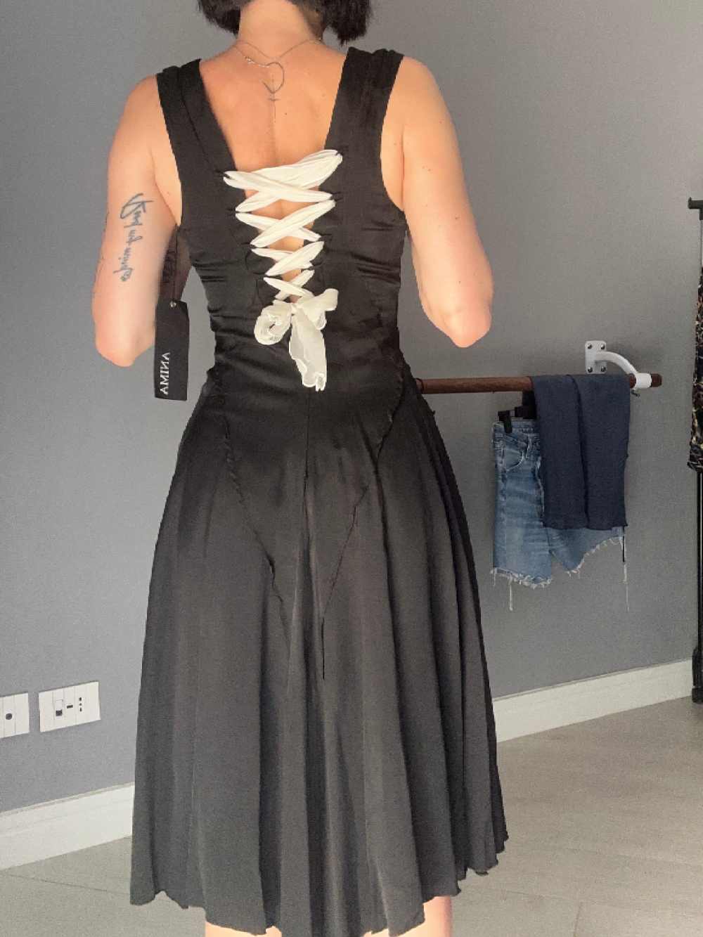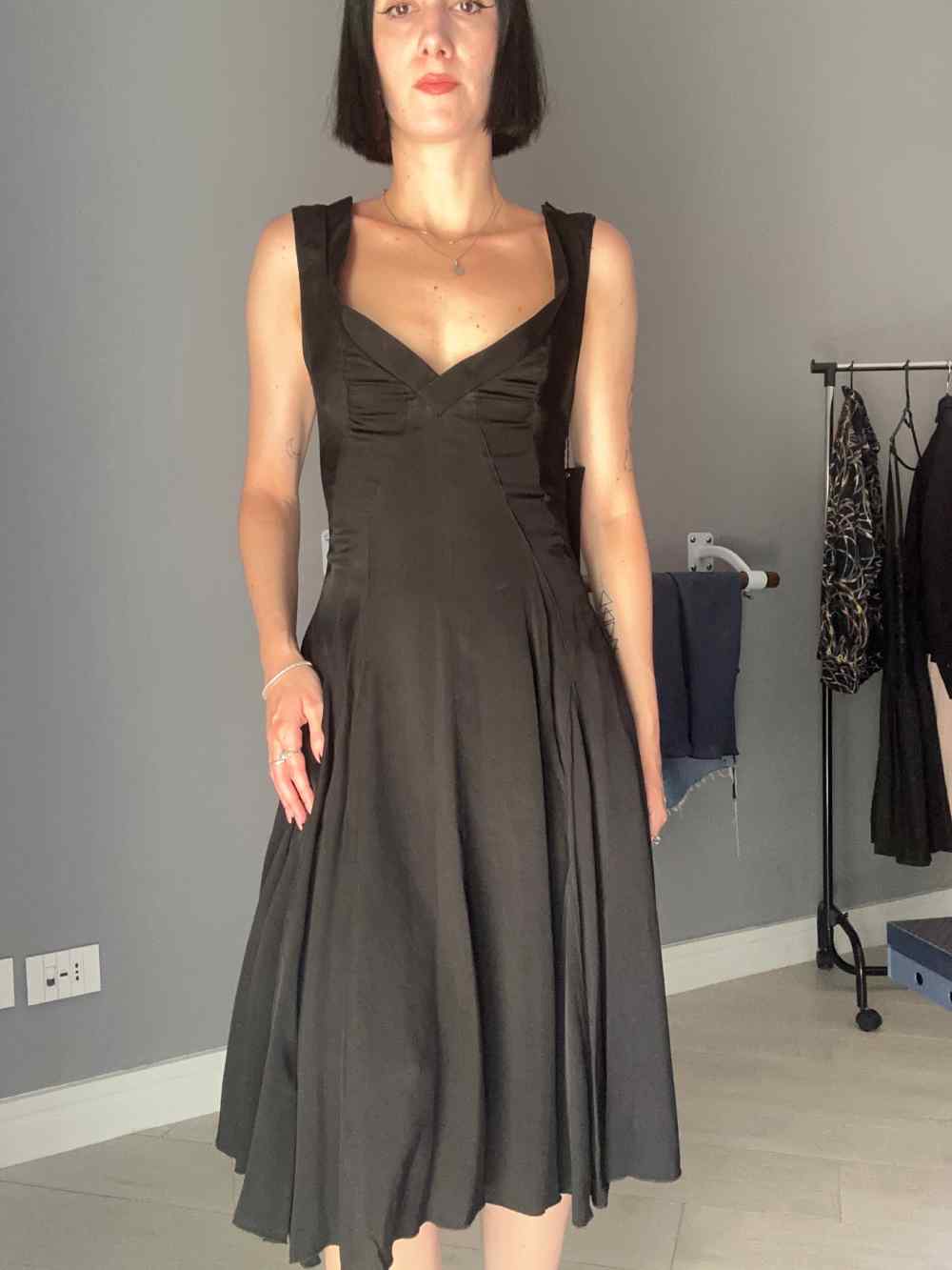 Seta e cupro, nero come la notte, bellissimo e delicato scollo, dietro ha dei lacci bianchi che stringono o allargano il bustino dell'abito e nascondono una scollatura profonda sulla schiena. Stretto in vita, si allarga fino a sotto le ginocchia. Presenta ancora il cartellino. I lacci sul retro possono essere sostituito con nastri e laccetti di qualsiasi tessuto o colore.