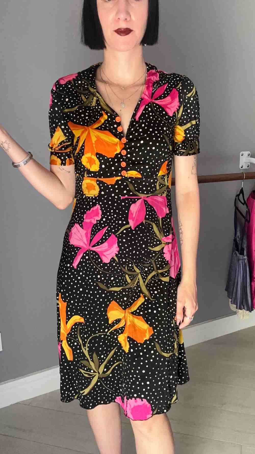 Abito corto base nera con pois bianchi e fiori rosa e arancione. Piccola fascia in vita, bottoncini arancioni sulla scollatura, mezze maniche carinissime, corte e un po' a sbuffo, scende più largo su fianchi e cosce.