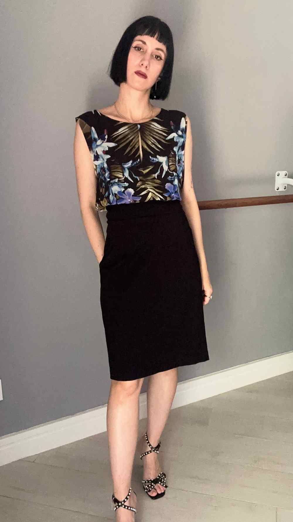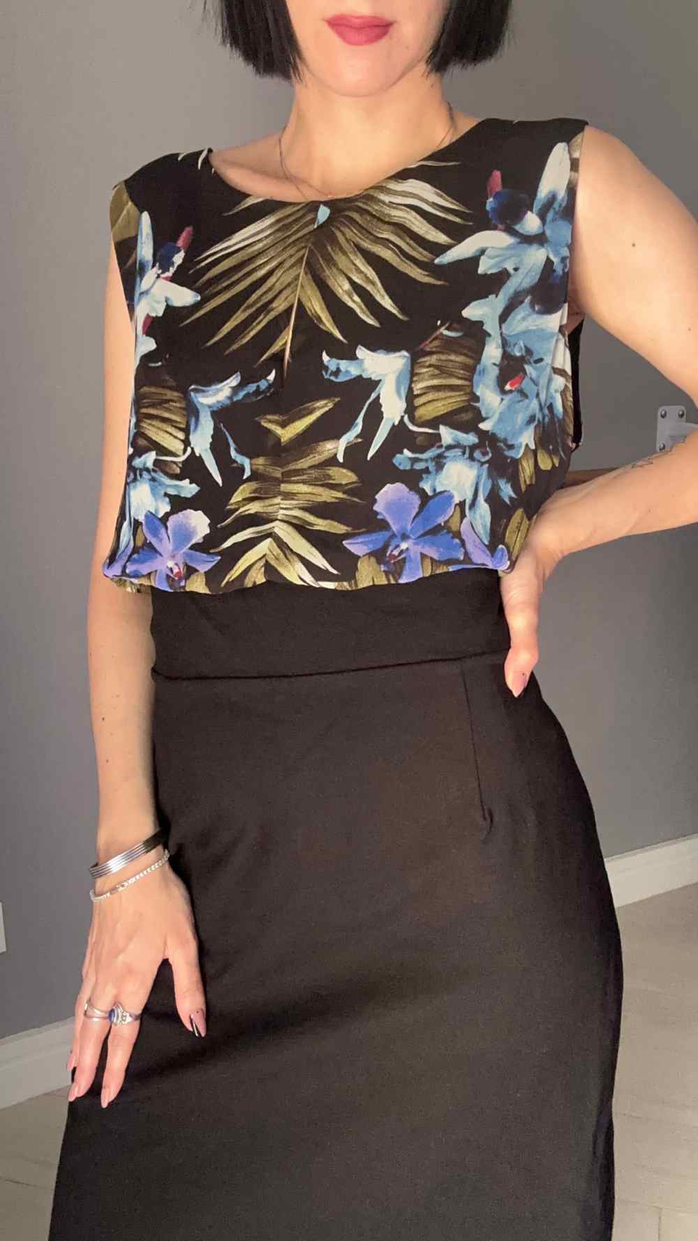 Abito stretto in vita, a tubino, nero, con la parte di sopra con fiori.