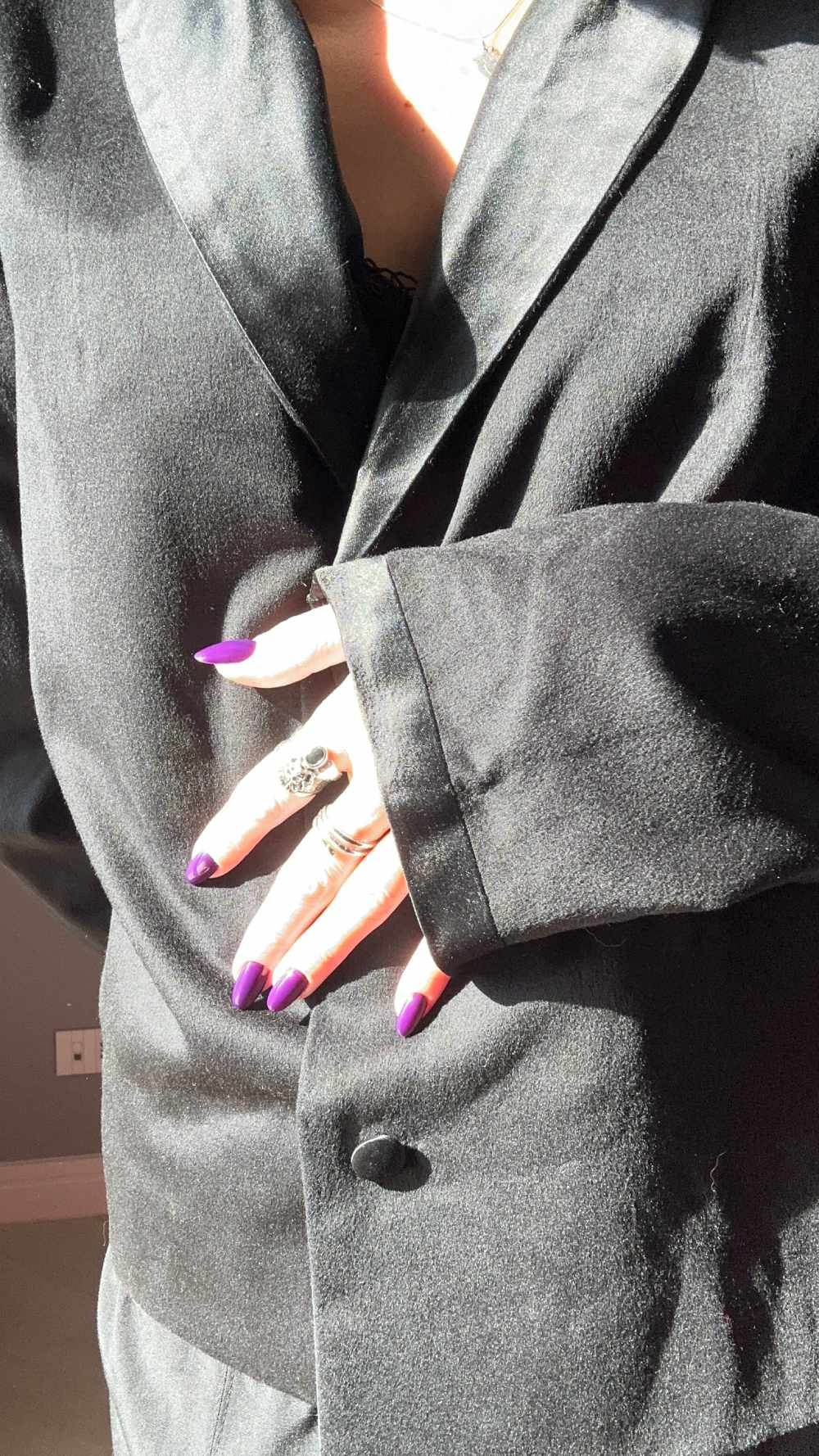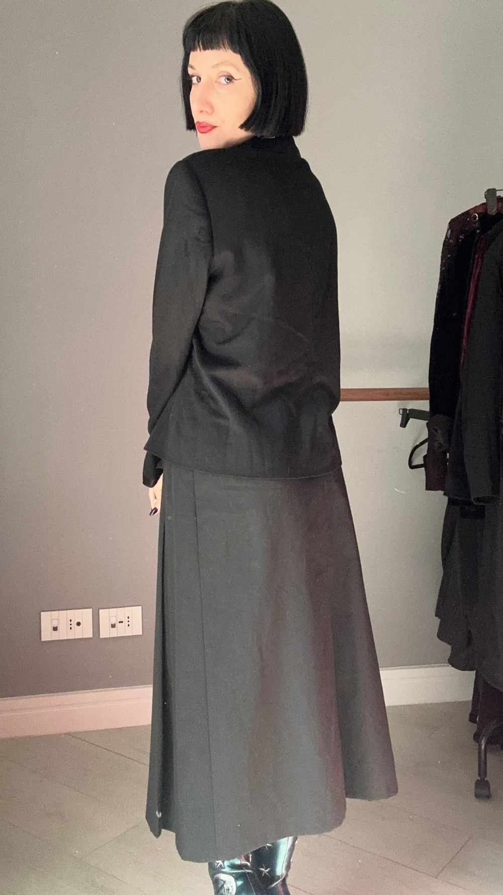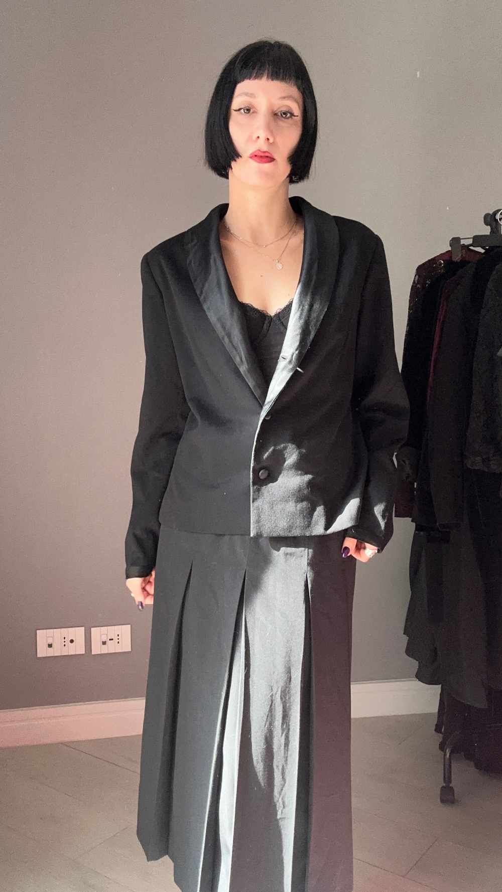 Blazer nero, fit morbido, revers, bottoni e polsini in raso.