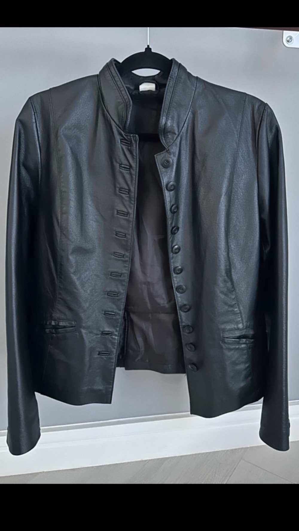 Meraviglioso blazer in vera pelle, colore nero, con colletto tipo coreano, costernato di bottoni bellissimi sul davanti e taschine. Mi ricorda molto le giacche dei Bleatles. Dietro ha uno spacco doppio.