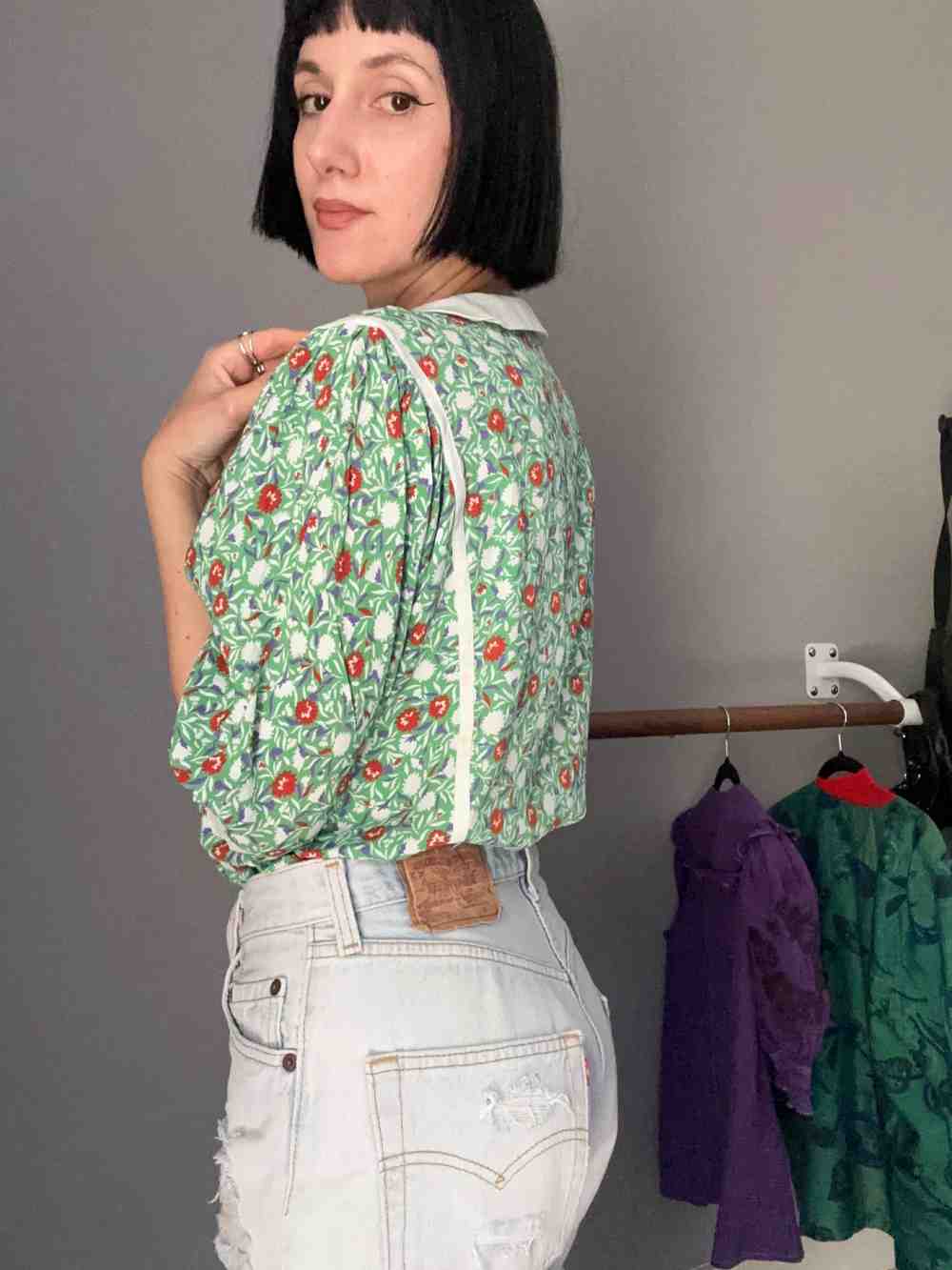 Camicia bianca in seta, con fiori versi e rossi, mezze maniche a sbuffo e raglan, colletto bianco e bottoncini bianchi. In perfette condizioni vintage, ha delle lievi macchie sul colletto, tuttavia non sono evidenti quando indossata. Veste al meglio una taglia 42-44 ma fai fede alle misure.