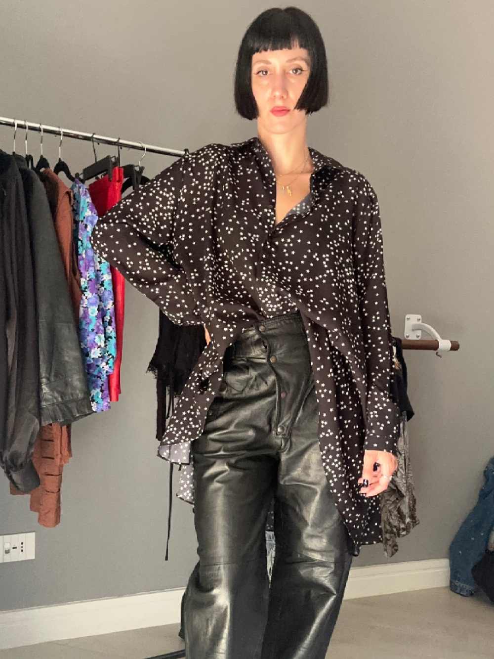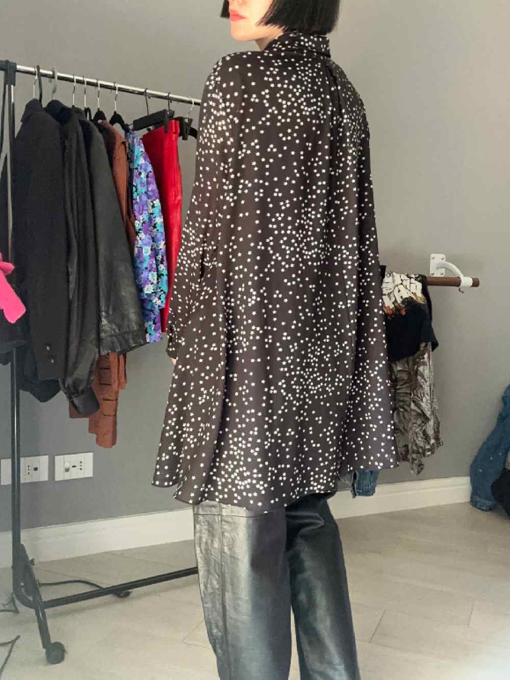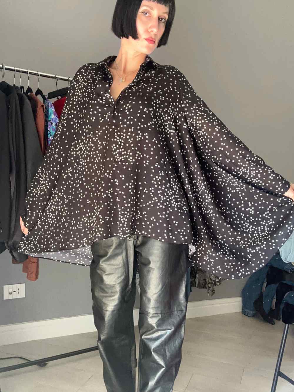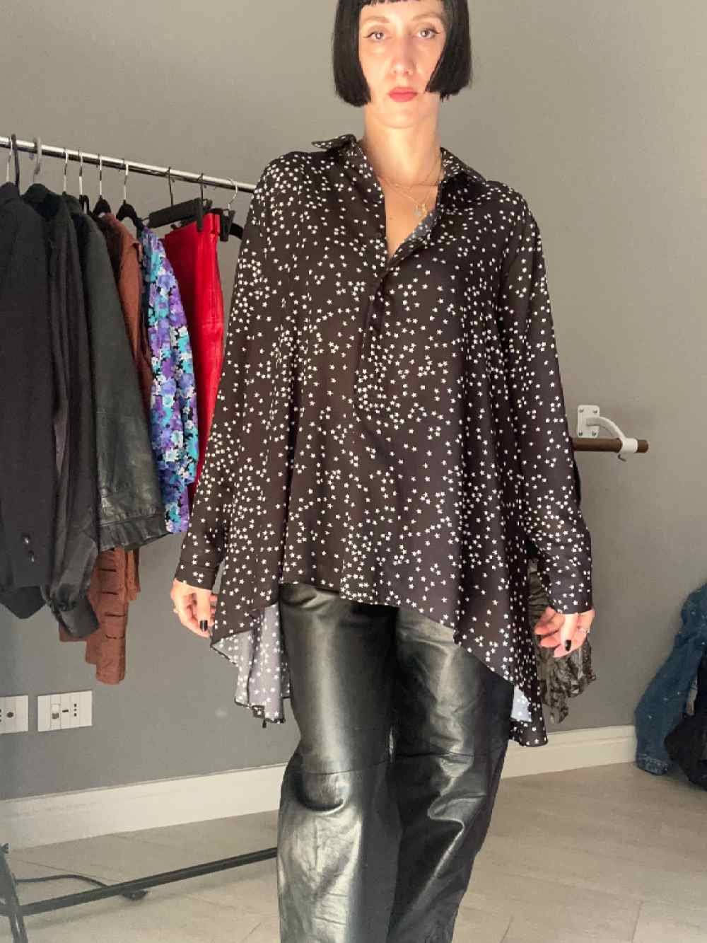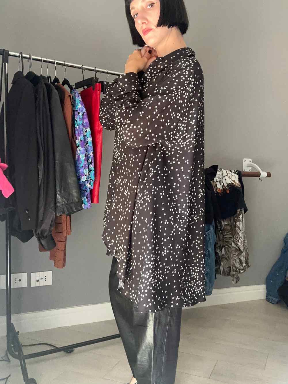 Nera, manica lunga, tempestata di stelle. Oversize, sta bene a qualsiasi taglia, dietro è più lunga. In perfette condizioni vintage, non presenta imperfezioni, veste al meglio una taglia L ma fai fede alle misure.