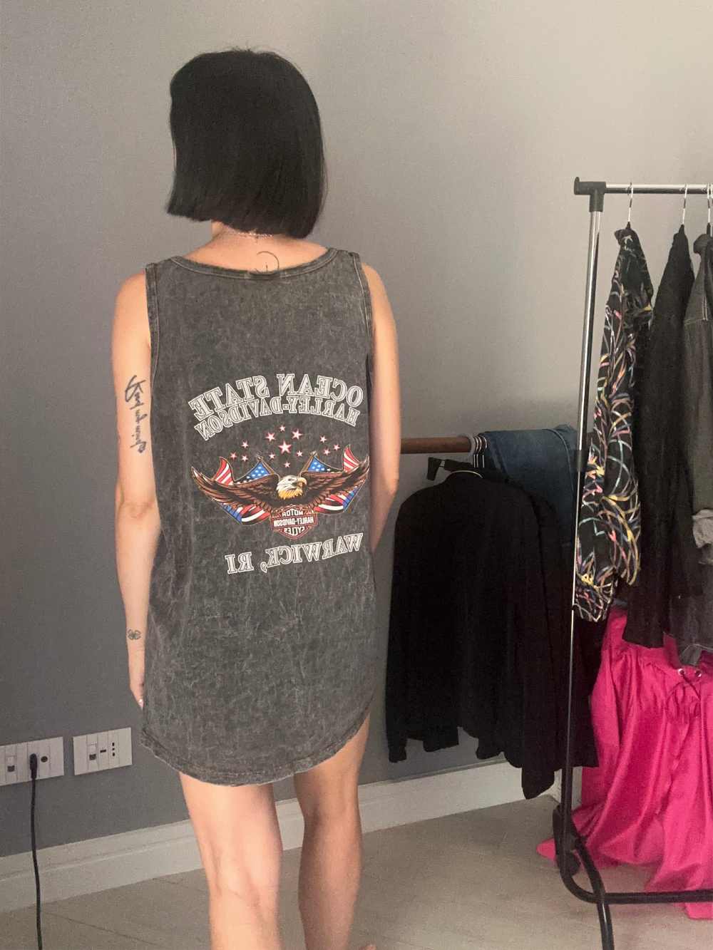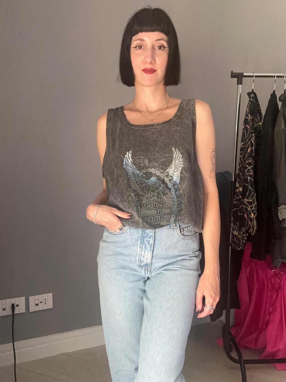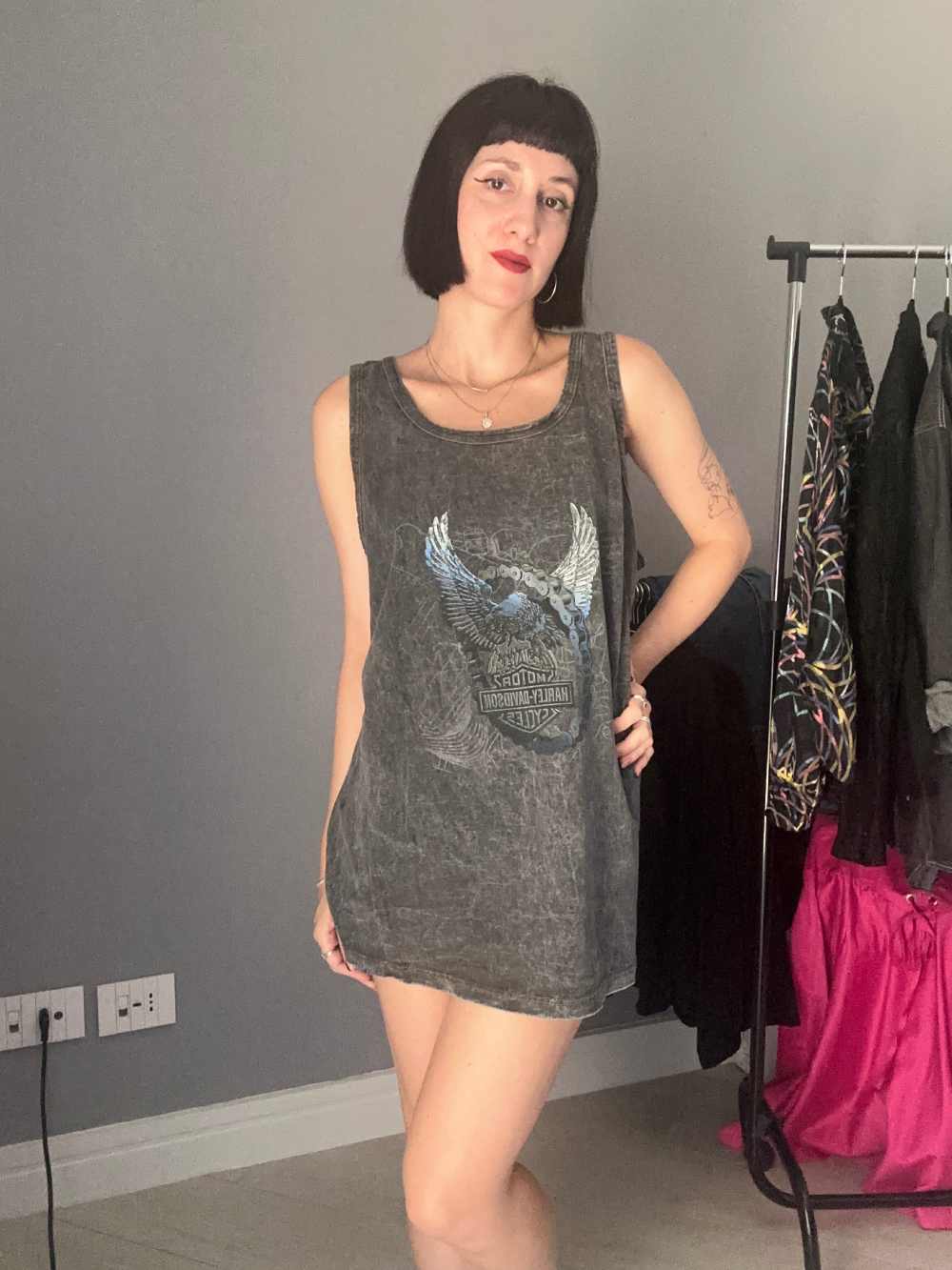 Canottiera grigia con stampa davanti e dietro marca Harley Davidson.