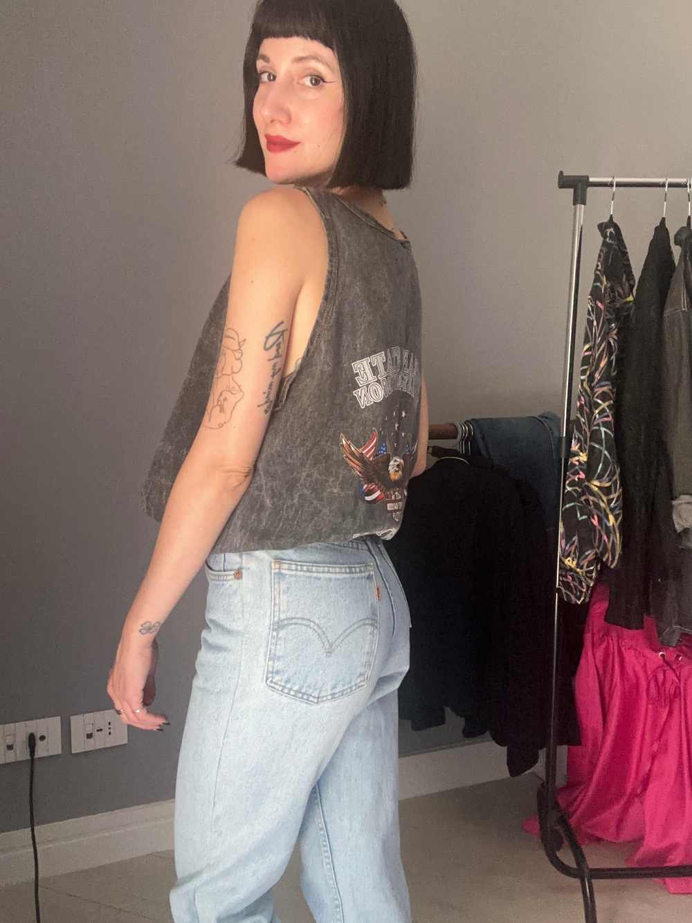 In perfette condizioni vintage, la stampa davanti è leggermente sbiadita, veste al meglio una taglia M ma fai fede alle misure.
