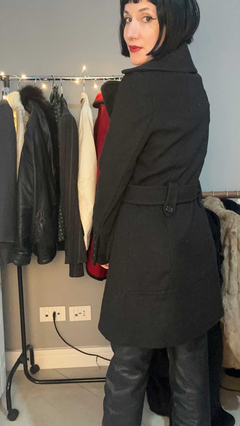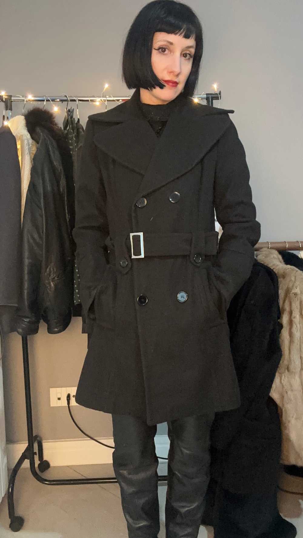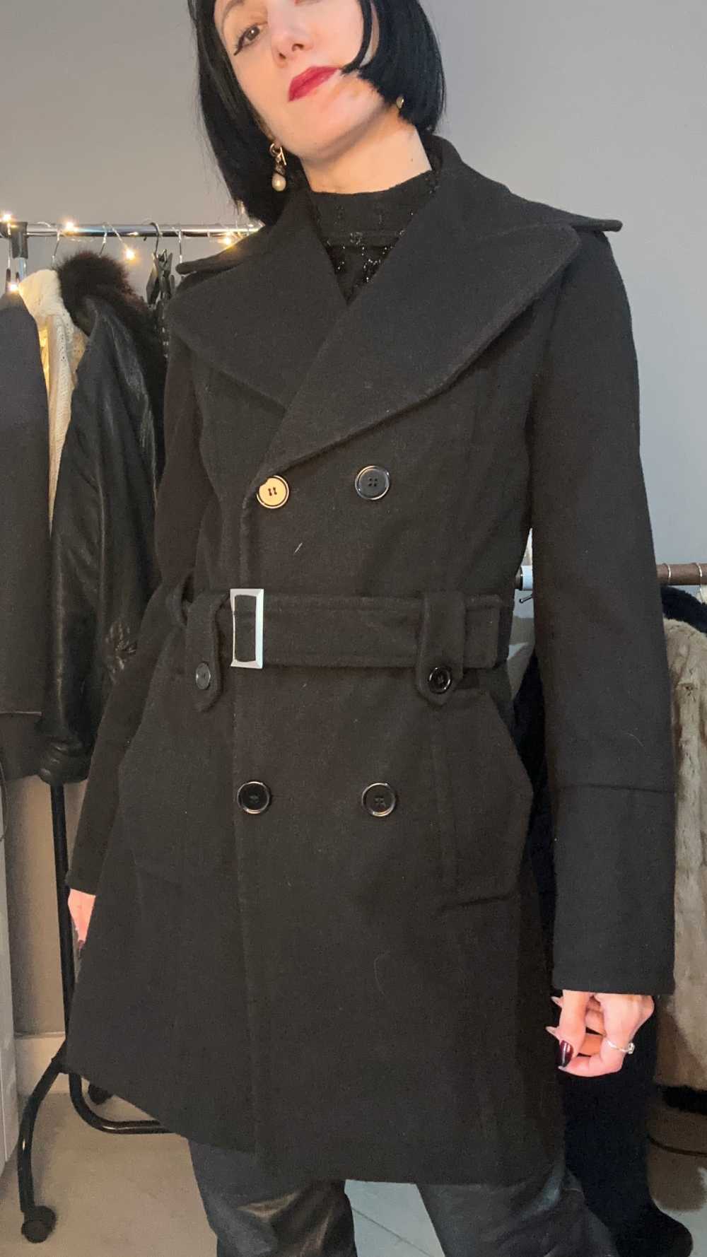 Cappottino nero con cintura, chiusura doppiopetto. In poliestere e viscosa vintage, risale ai primissimi anni 2000.