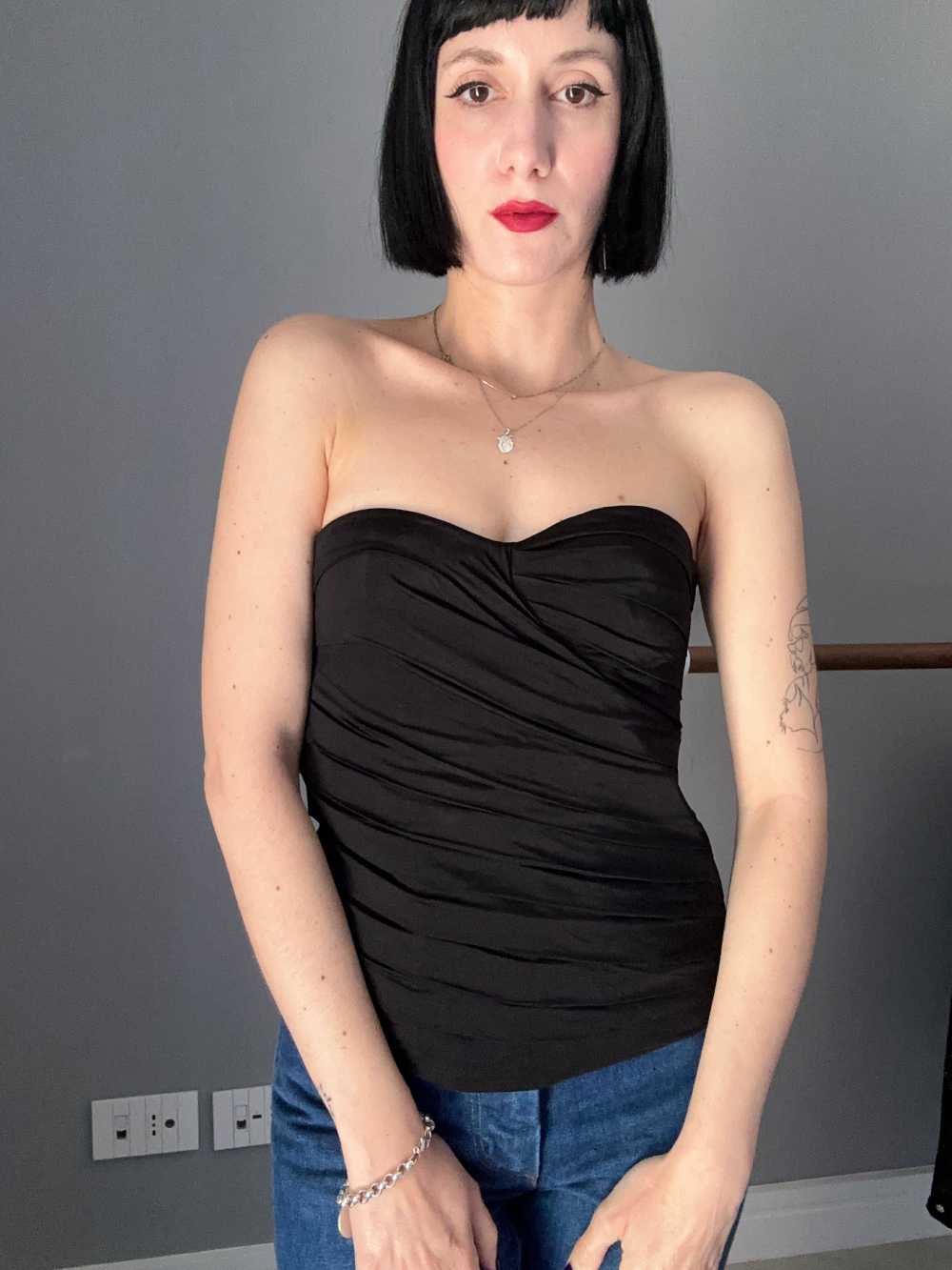 Corpetto nero marca Pinko, apertura laterale con zip, tessuto leggero con pieghe, parte alta leggermente a forma di cuore. In perfette condizioni vintage, non presenta imperfezioni, veste al meglio una taglia 40 ma fai fede alle misure.