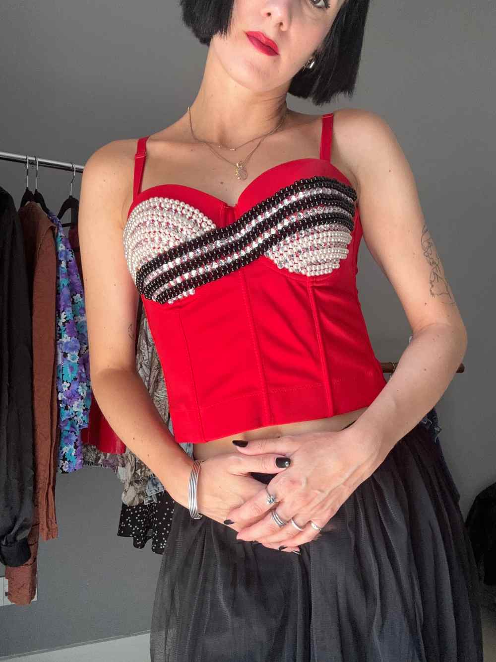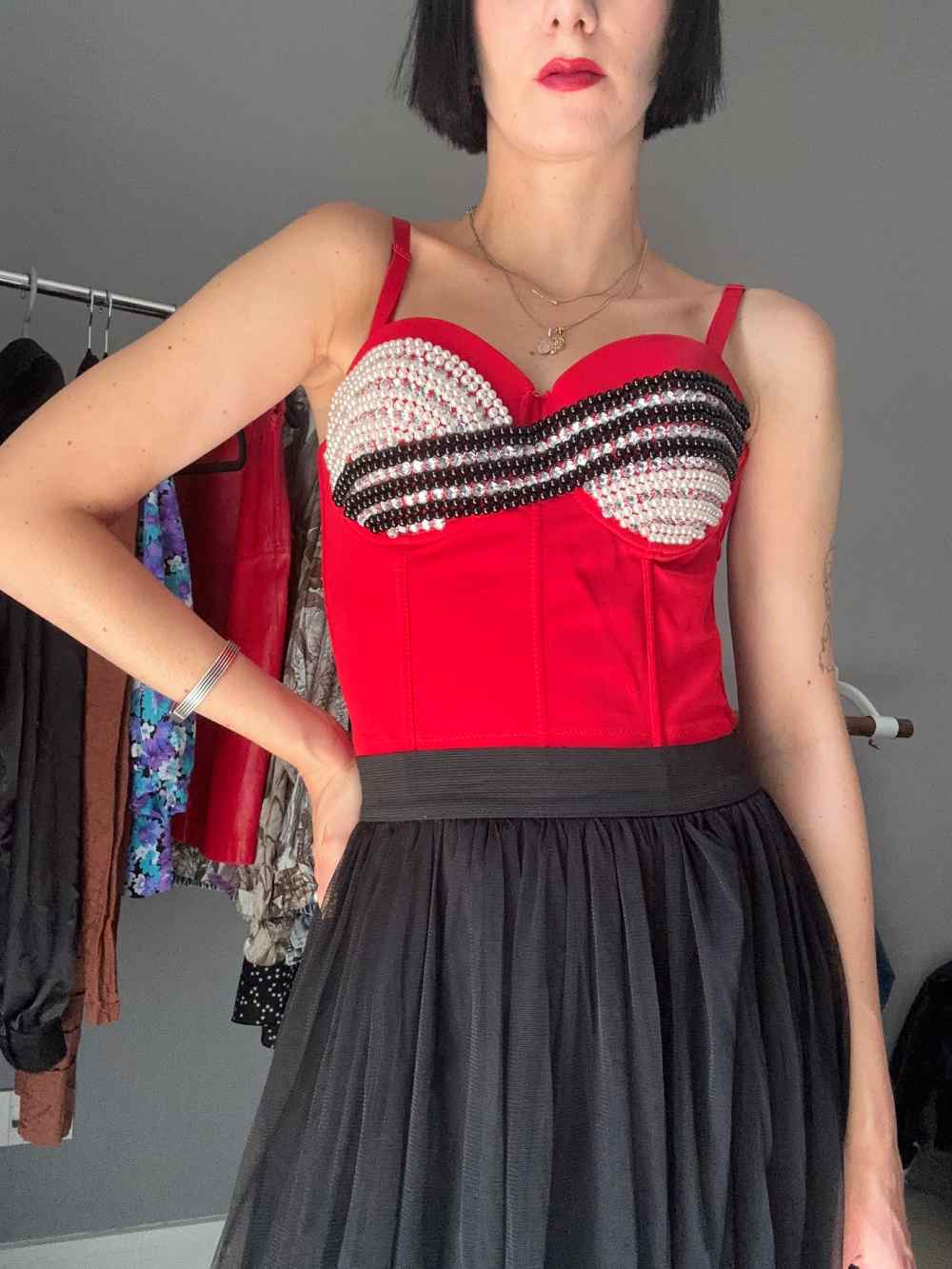 Corpetto favoloso, rosso fuoco con ganci sul retro, coppe e decorazioni di perline nere e bianche sul reggiseno. Ha spalline removibili.
