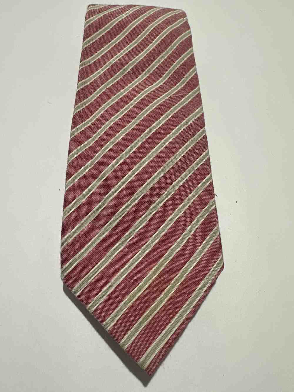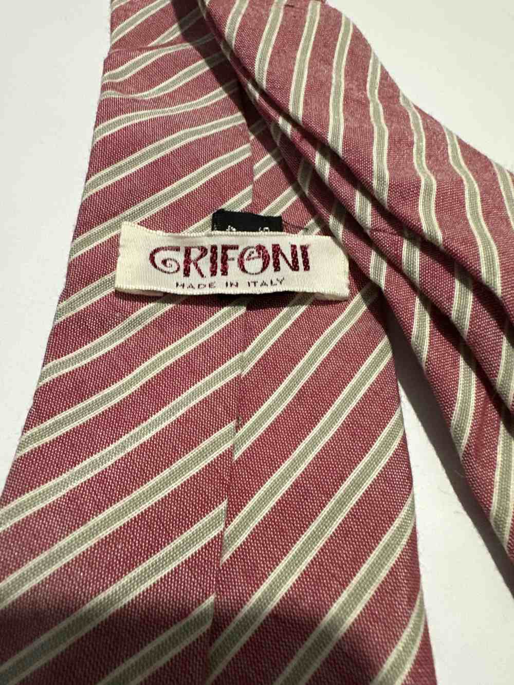 Cravatta vintage in seta e cotone. Base rossa con righe laterali beige e verde militare. Marca Grifoni. Made in Italy.