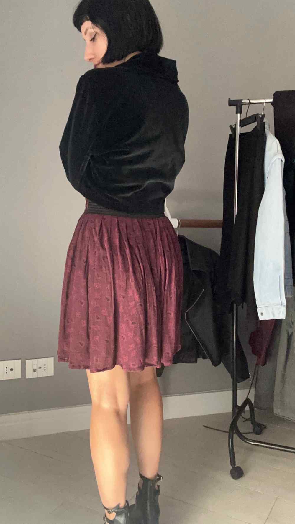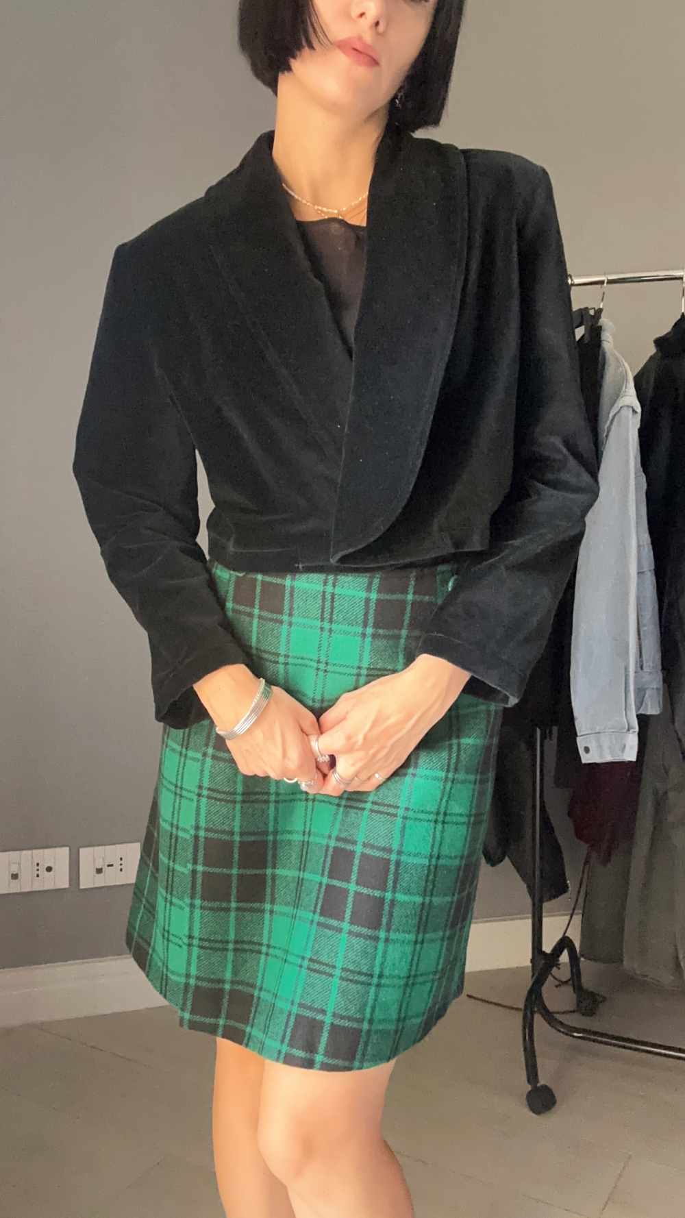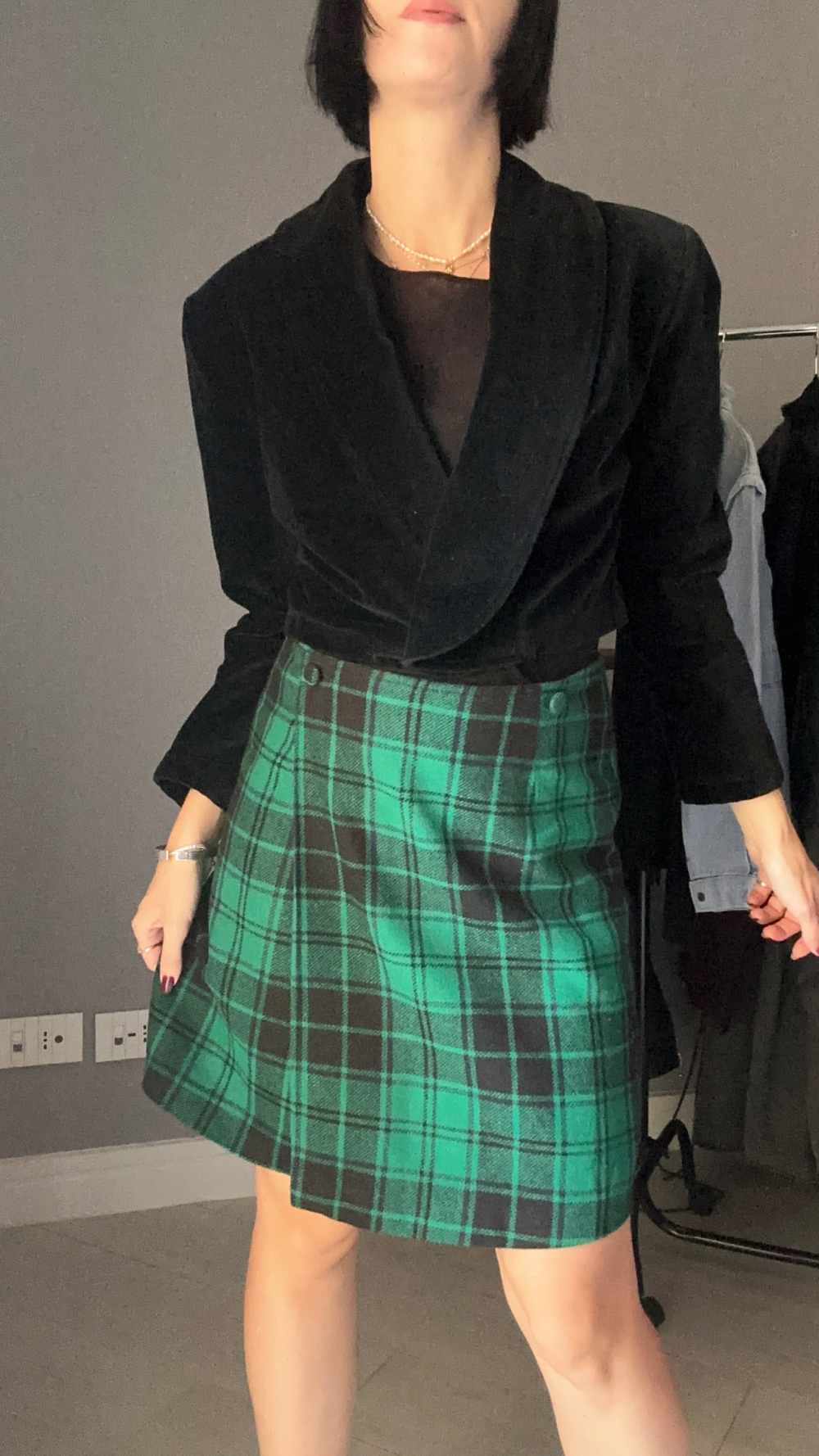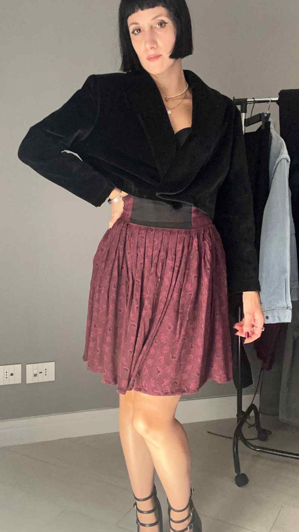 Giacca nera in velluto, corta, con bottone, spalline sottili.
