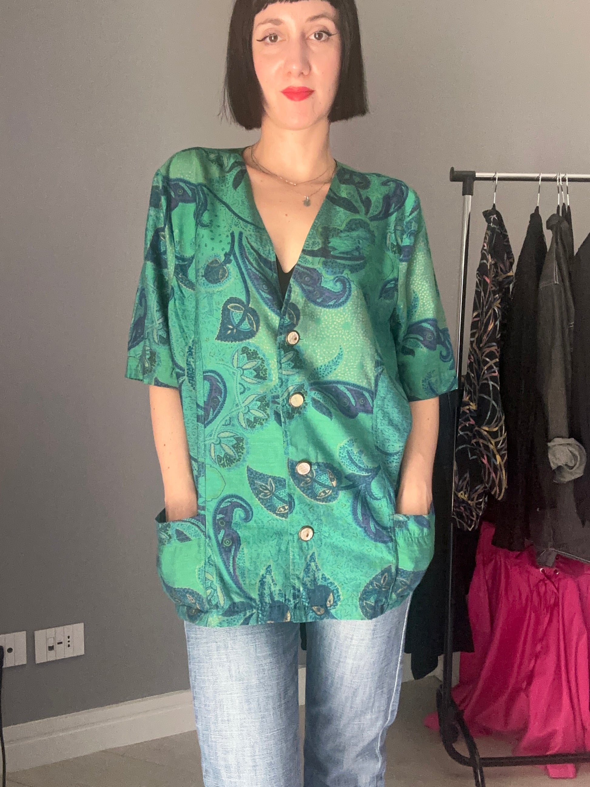 Giacca leggera, sartoriale, non c'è etichetta ma il tessuto è cotone e lino. Mezza manica, bottoni in madreperla con contorno dorato, taschine, colore verde con bellissime decorazioni.