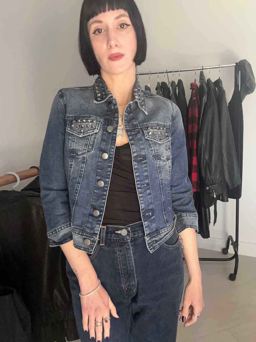 Bellissimo giubbottino di jeans marca Sisley Y2K lavaggio blu. Corto in vita, maniche a ¾, ha bottoncini argento scuro e borchie argento metallizzato sui taschini e sul colletto.