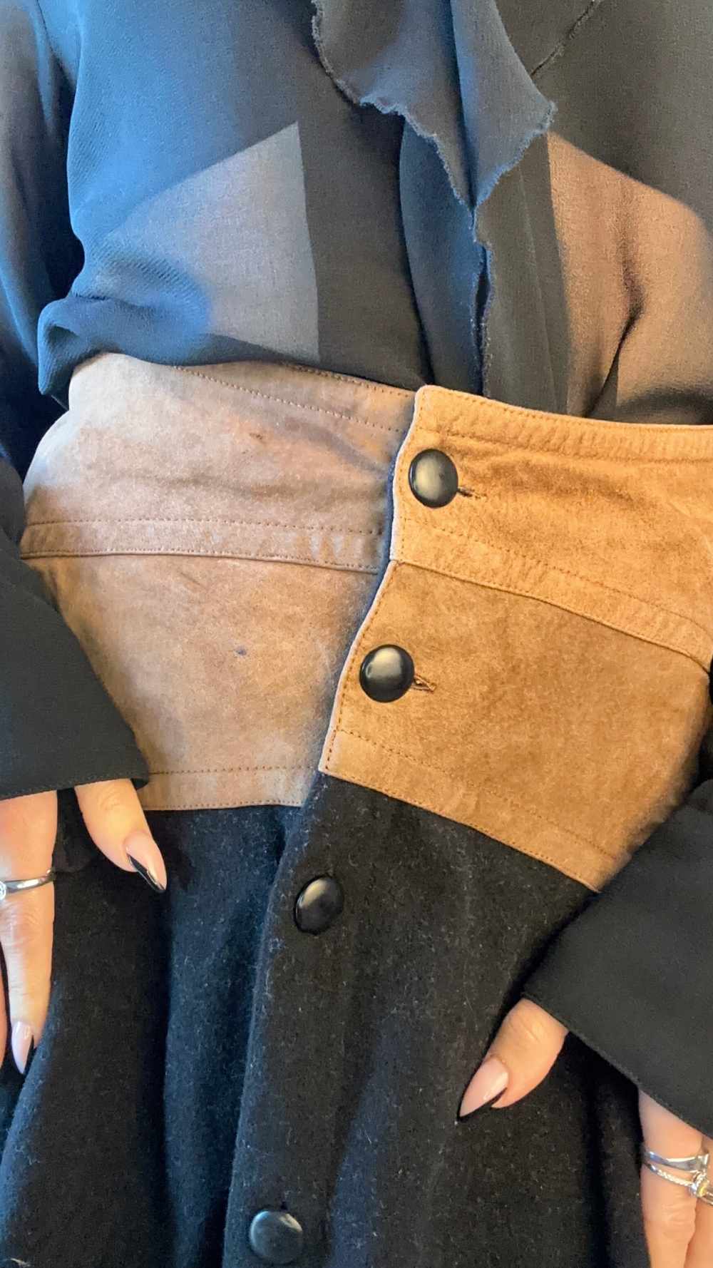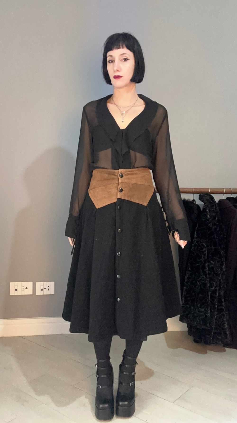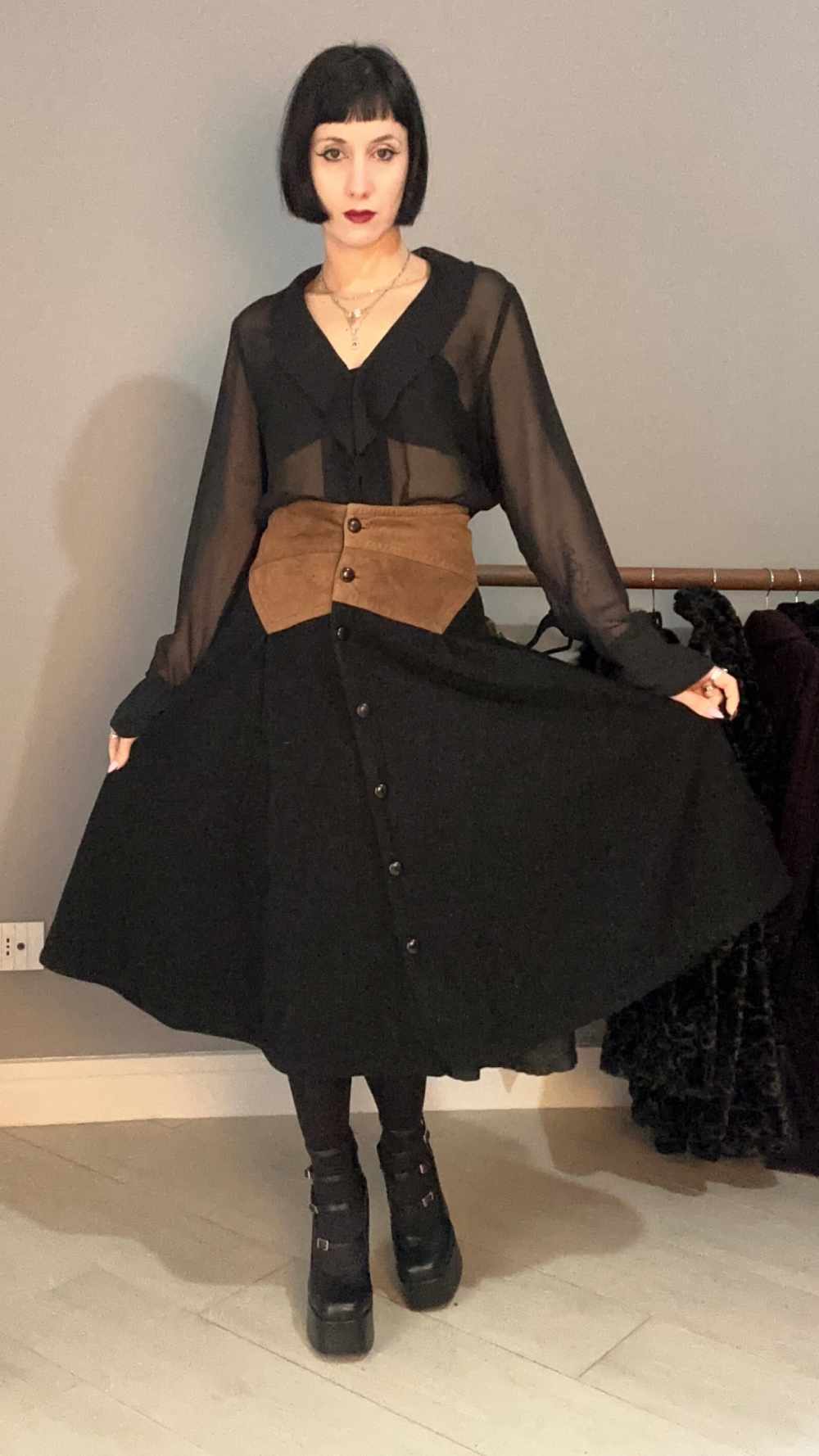 Bellissima gonna in lana con bottoni neri davanti, in lana colore nero. a ruota con fascia in vita in vera pelle color cammello.