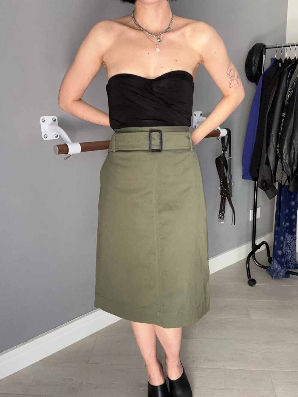 Gonna verde militare midi, a tubino con cintura. Ha tasche davanti e un grazioso taschino sul retro.