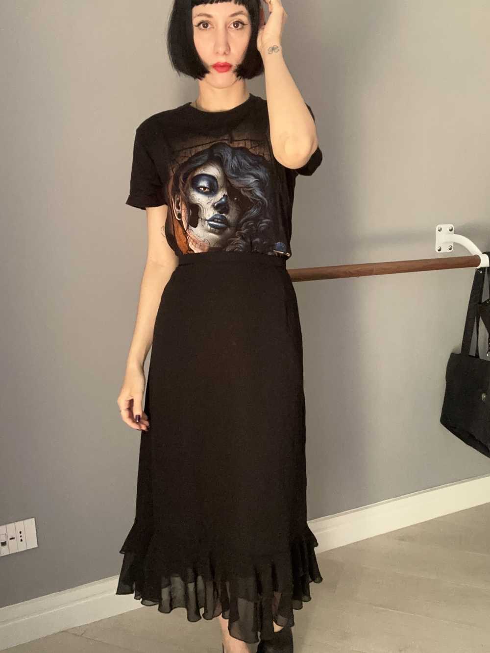 È una gonna nera resa inconfondibile grazie alle balze che presenta sul fondo. Indossala con una t-shirt semplice monocolore oppure con stampa, tipo una t-shirt rock, per un look alternativo, oppure puoi optare per un outfit classico con camicia in seta. Adorabile anche con un corpetto nelle notti d’estate.
