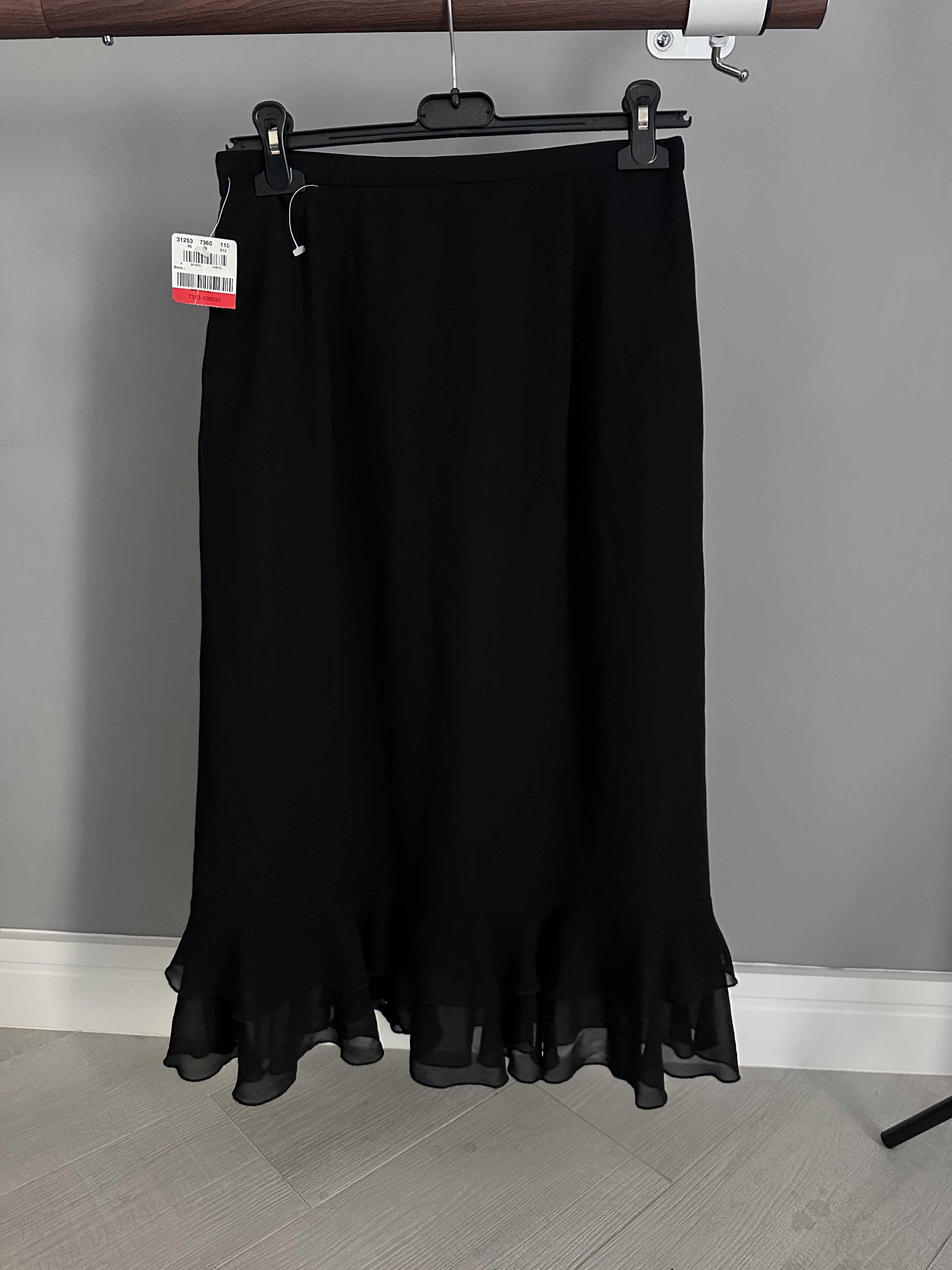 Gonna nera con balza, tessute leggerissimo e balza in organza. È nuova, ha ancora iol cartellino attaccato, in perfette condizioni vintage, non presenta imperfezioni, veste al meglio una taglia 42-44 ma fate fede alle misure.