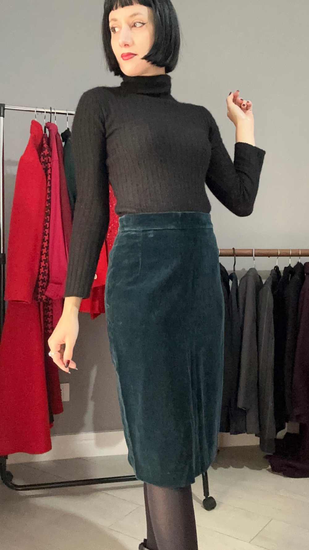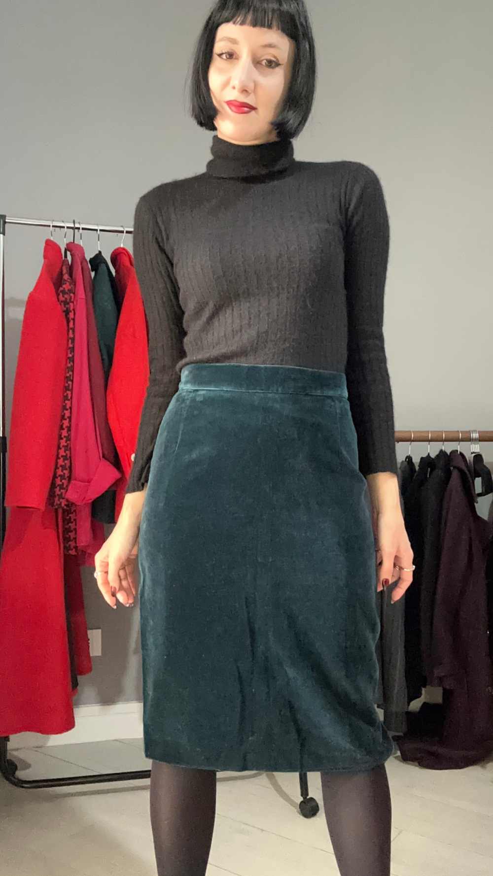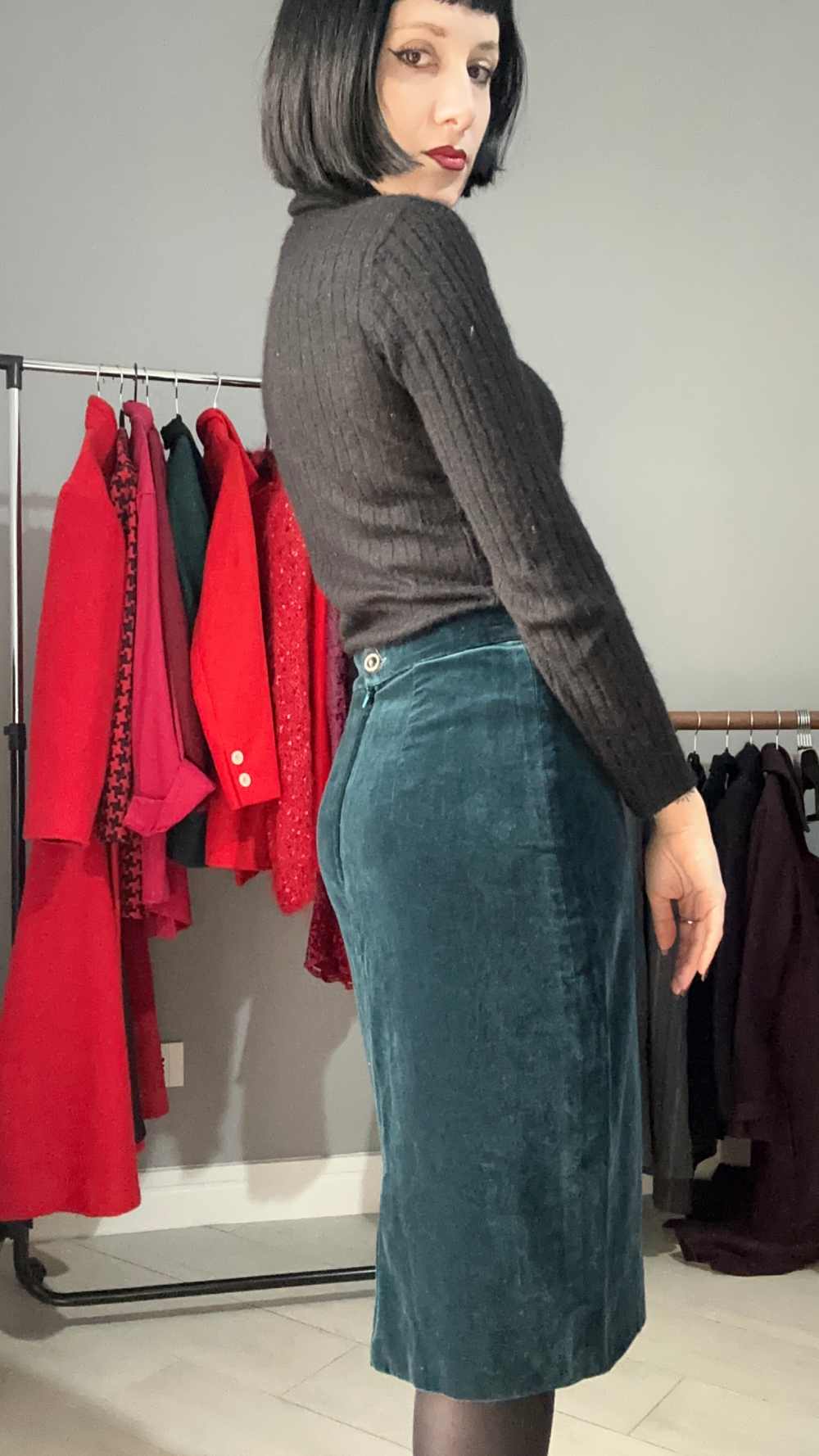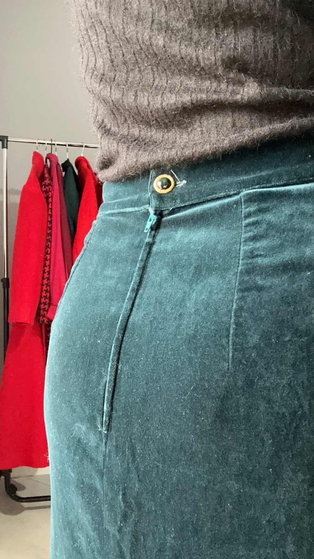 Gonna in velluto di un colore molto particolare: ottanio. Non se ne trovano molte, lei è un fondo di magazzino, vita alta, cade leggera e dritta. Si apre con zip sul retro e con un fantastico bottone gioiello. In perfette condizioni vintage, non presenta imperfezioni, veste al meglio una taglia S-M ma fai fede alle misure.