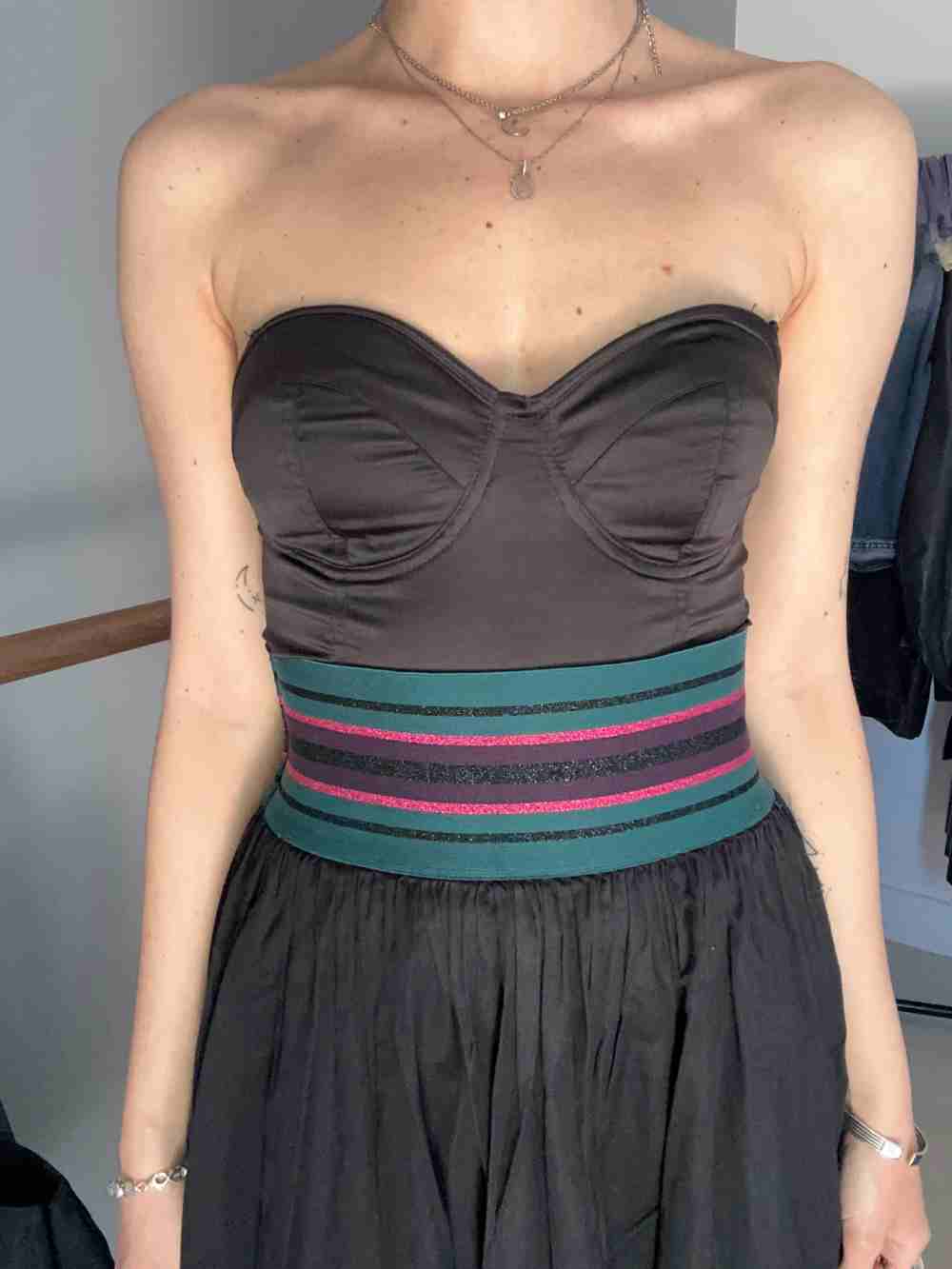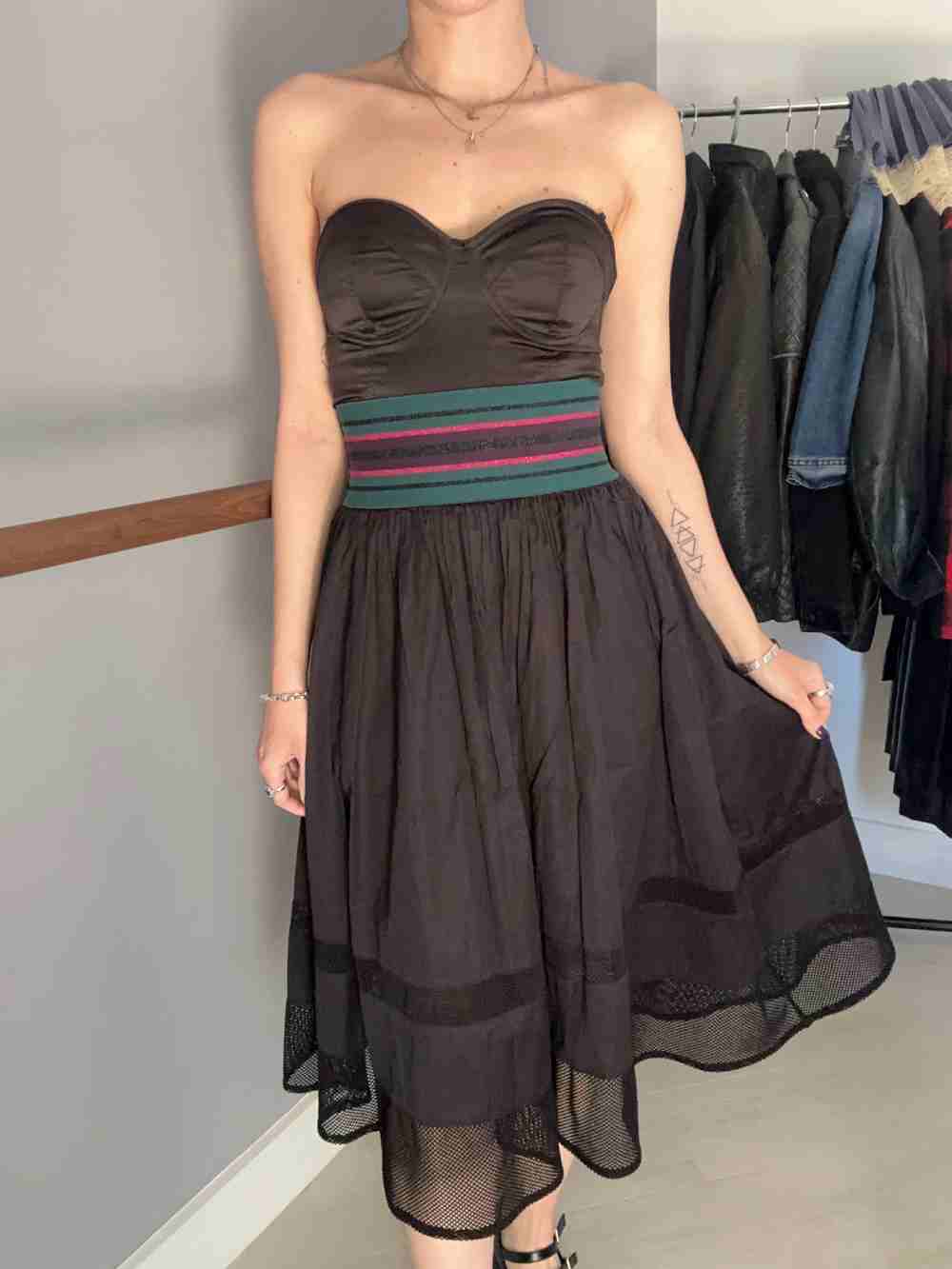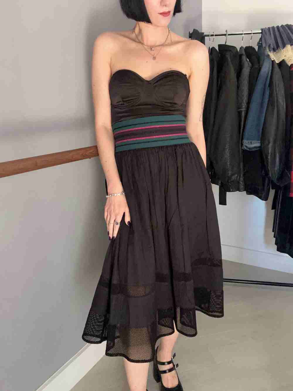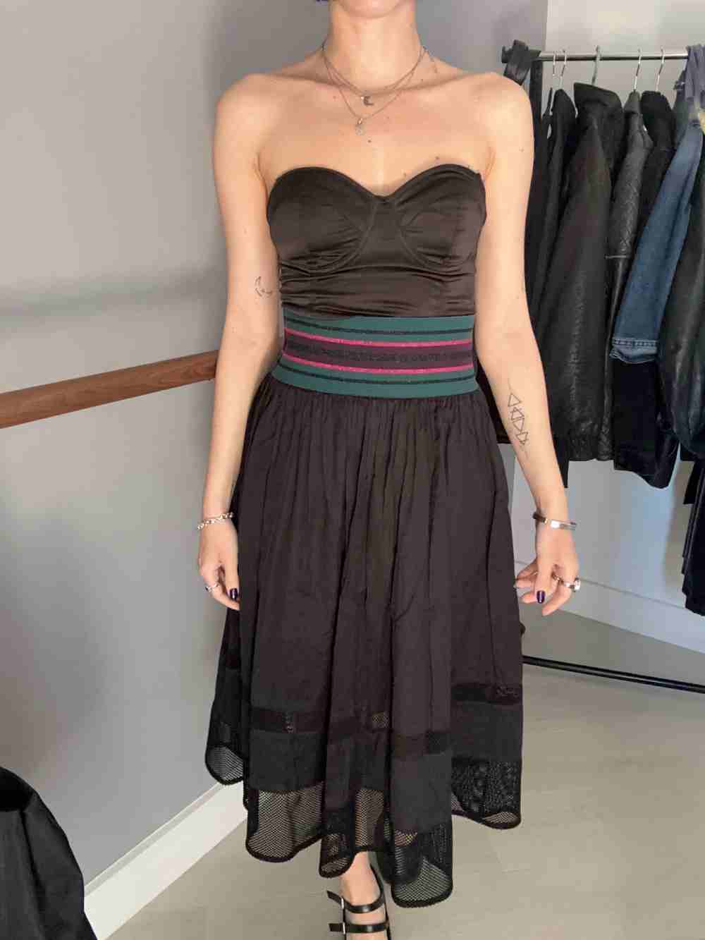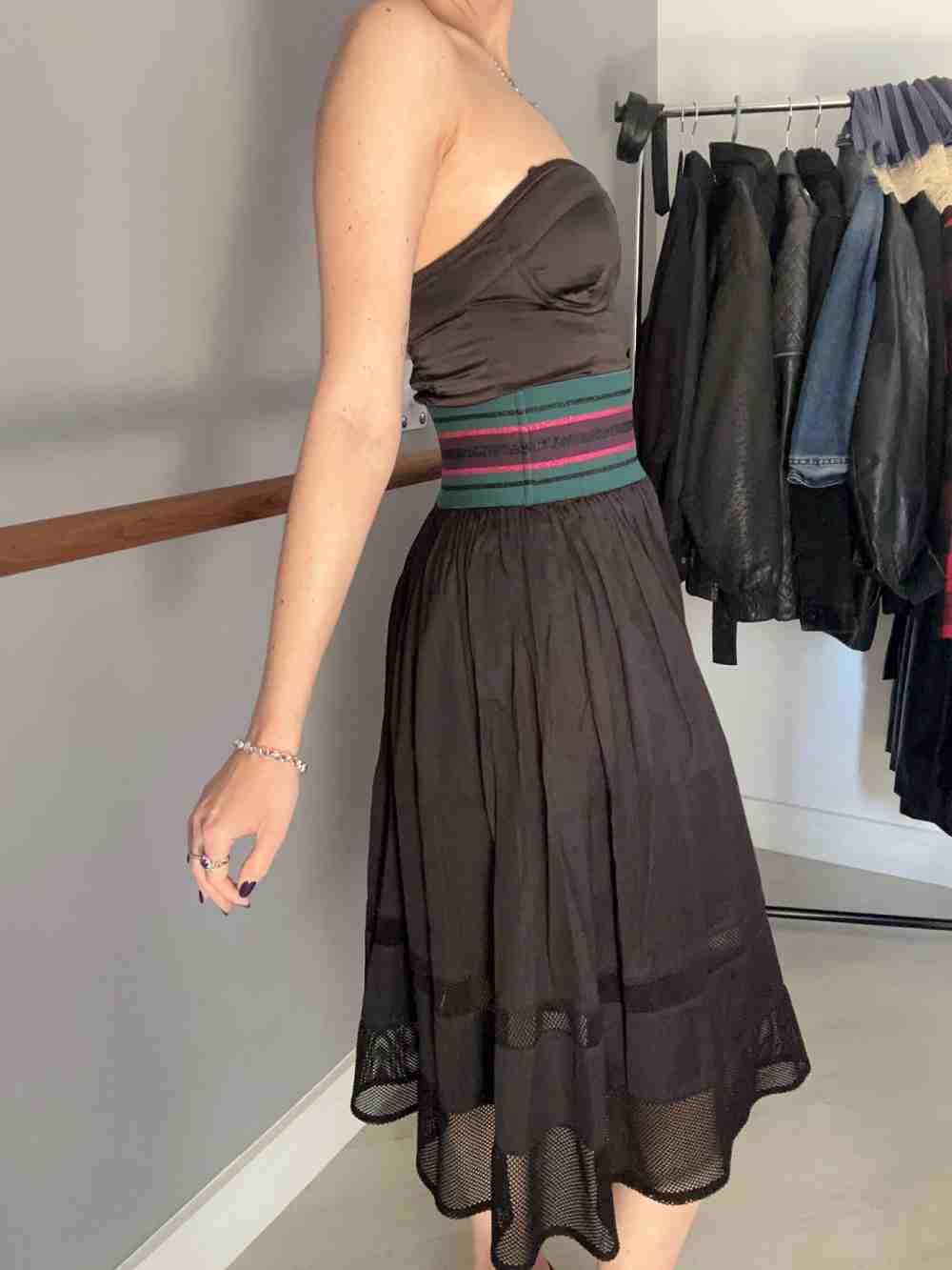 Gonna nera marca Sisley lunga fino al polpaccio. Ha un bellissimo cinturone in vita, elastico, colorato: verde, rosa e viola. La gonna si allarga fino ai polpacci sopra il ginocchio, larga, a campana con deliziose pieghe. Nella parte inferiore ha delle trasparenze, il tessuto, 100% cotone, diventa traforato formando due strisce in trasparenza.