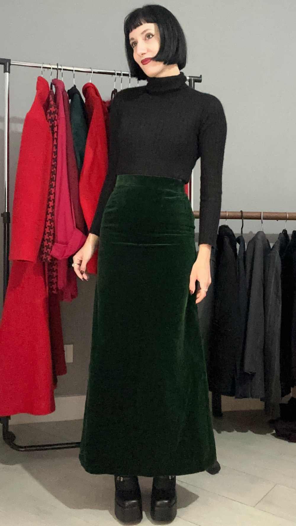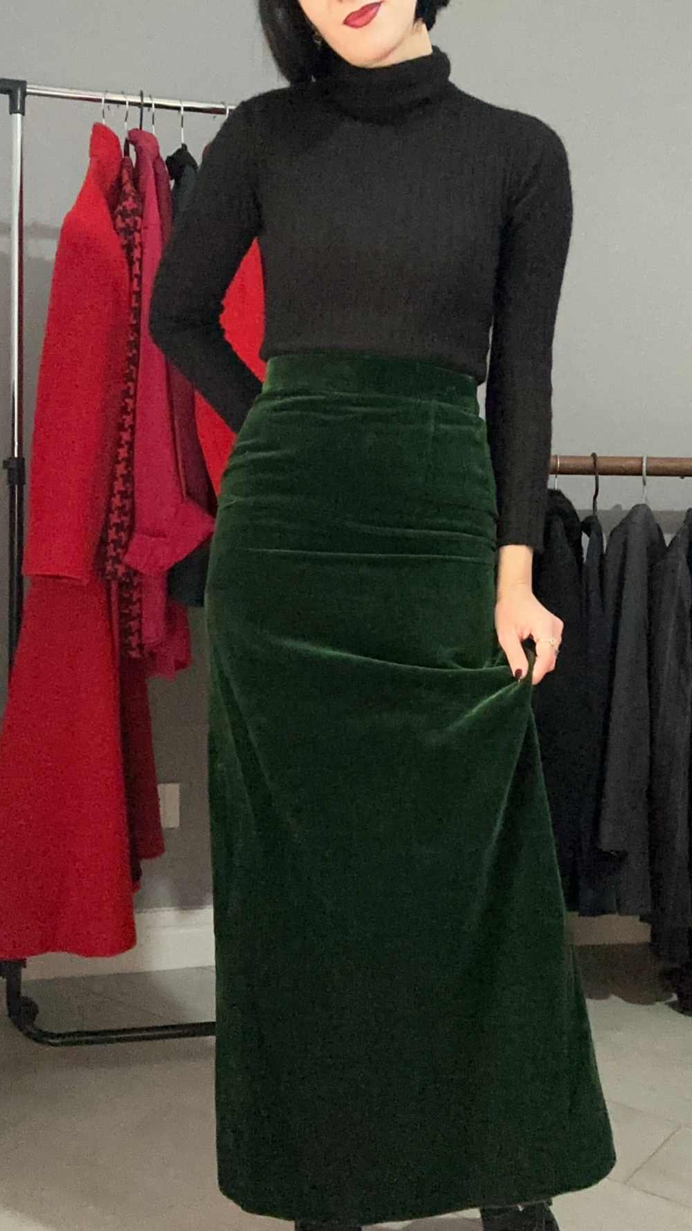 Gonna lunga colore verde bosco, sartoriale, in velluto. fascia in vita, si allarga sui fianchi e cade leggermente più stretta. È una taglia piccolissima, fatta a mano, leggi attentamente le misure. In perfette condizioni vintage, non presenta imperfezioni, veste al meglio una taglia 36-38 ma fai fede alle misure.
