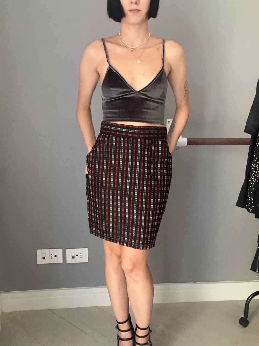 Gonna in lana leggera, fascia in vita, tasche più larghe che le conferiscono una forma particolare, come a palloncino ma non eccessiva. Fondo nero con quadretti rossi e grigio chiaro. Presenta un finto taschino con fodera esterna sul lato destro. Lunghezza al ginocchio. In perfette condizioni vintage, non presenta imperfezioni, veste al meglio una taglia 42 ma fai fede alle misure.