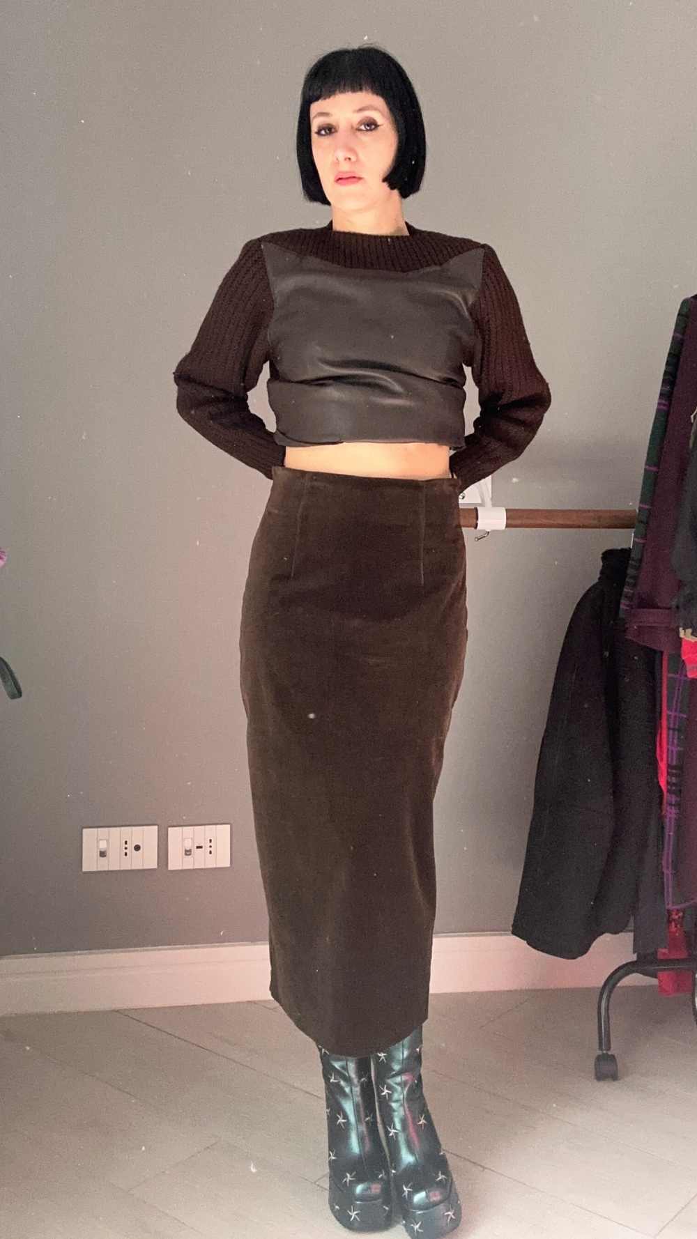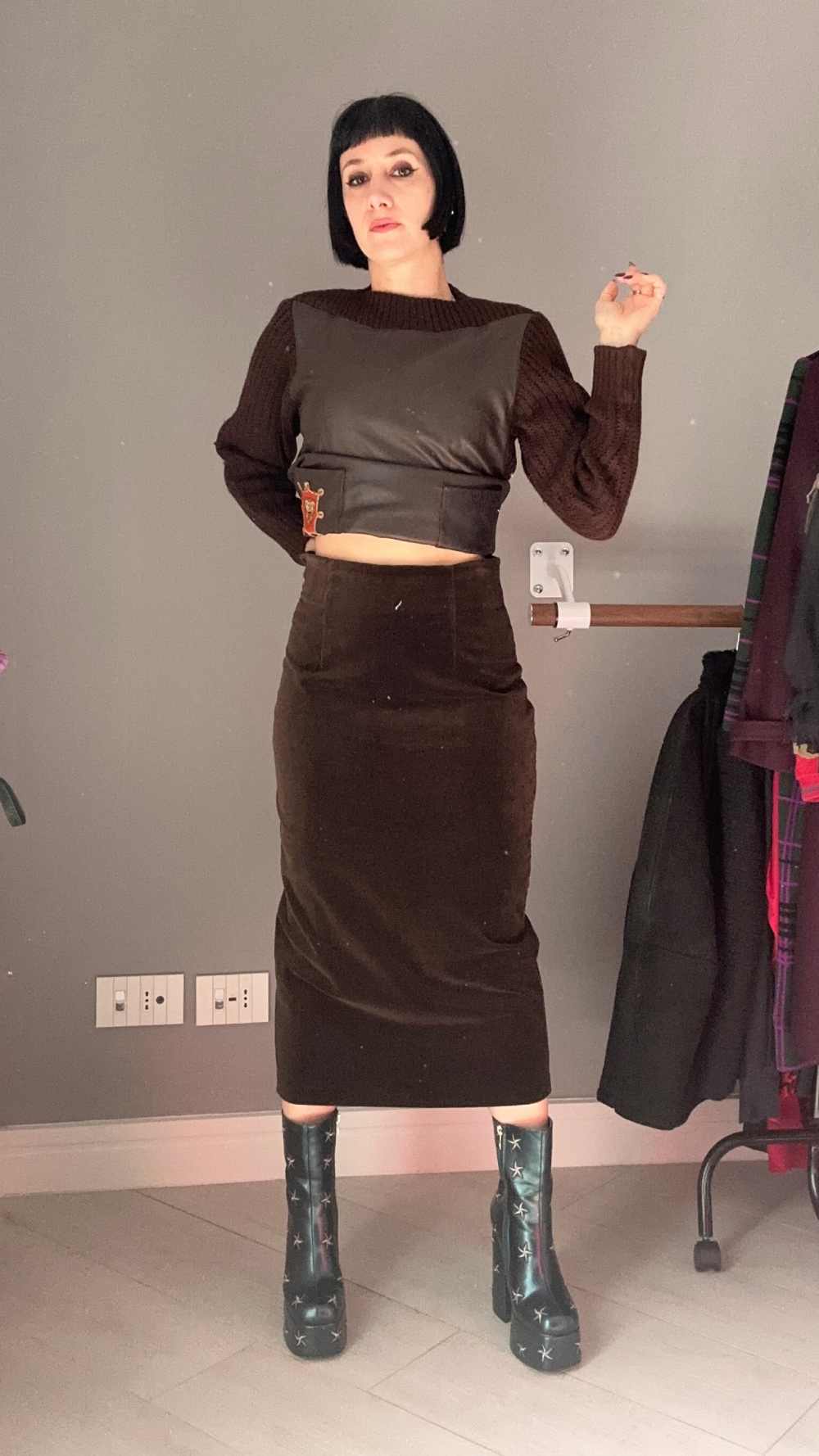 Bellissima gonna lunga, stretta, in velluto colore marrone. Marca Nerina Bugatti, chiusura zip sul retro, piccolo spacco sul retro, lunghezza sotto il polpaccio. In perfette condizioni vintage, non presenta imperfezioni, veste al meglio una taglia S-M ma fai fede alle misure.