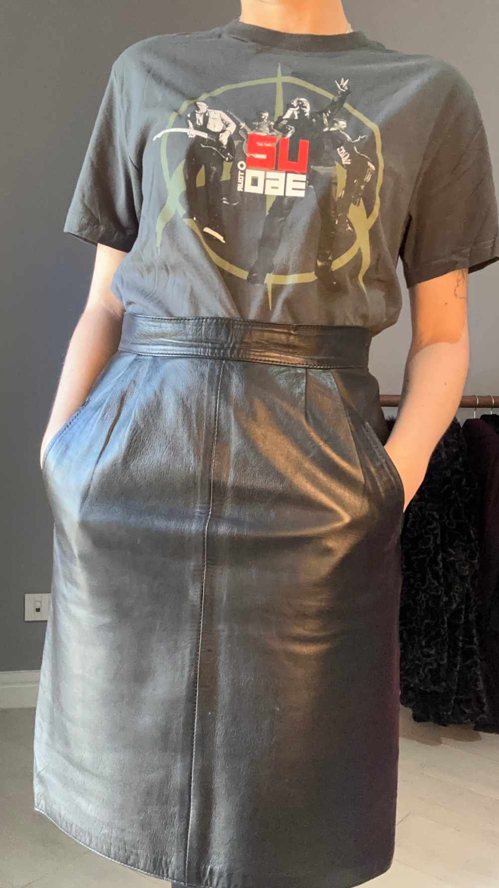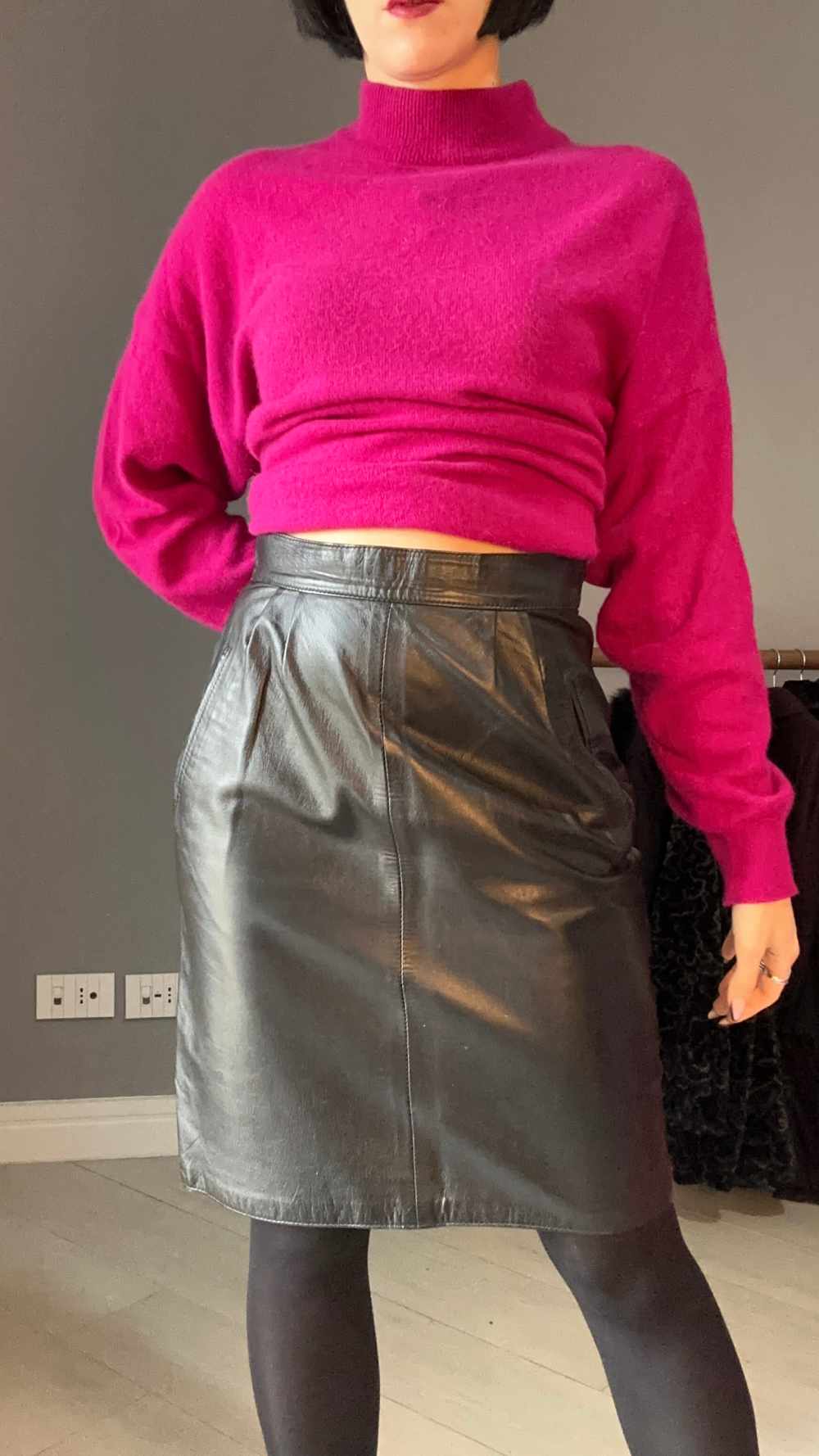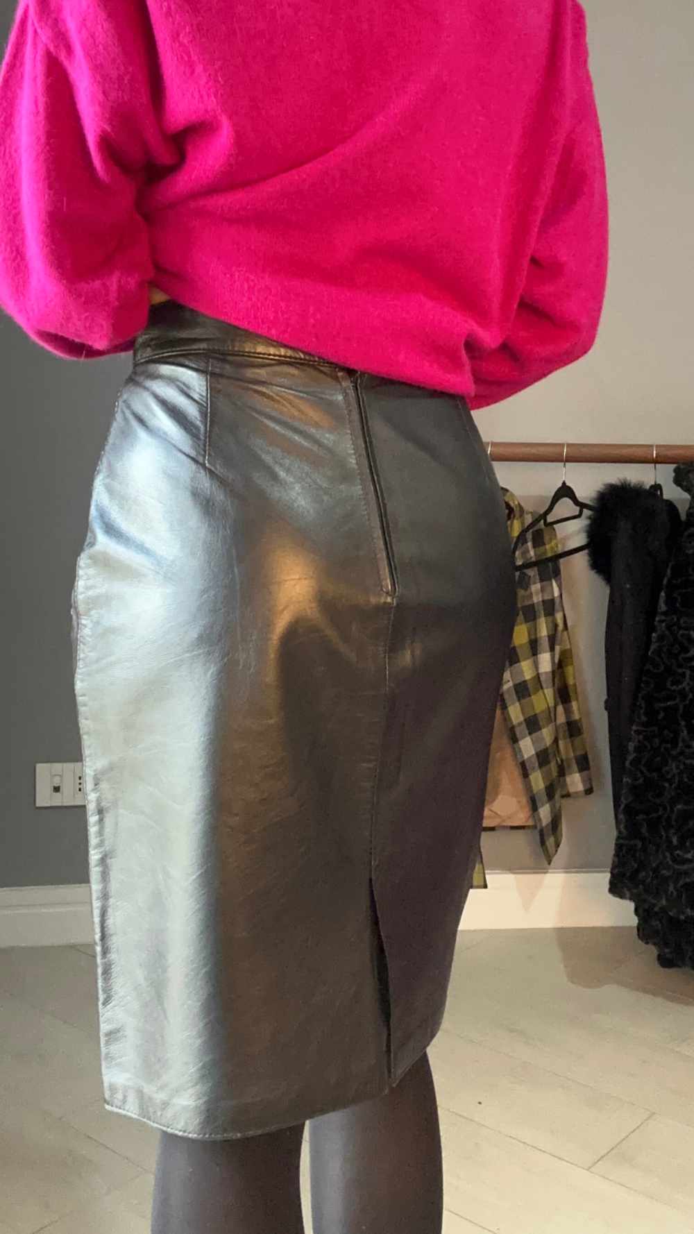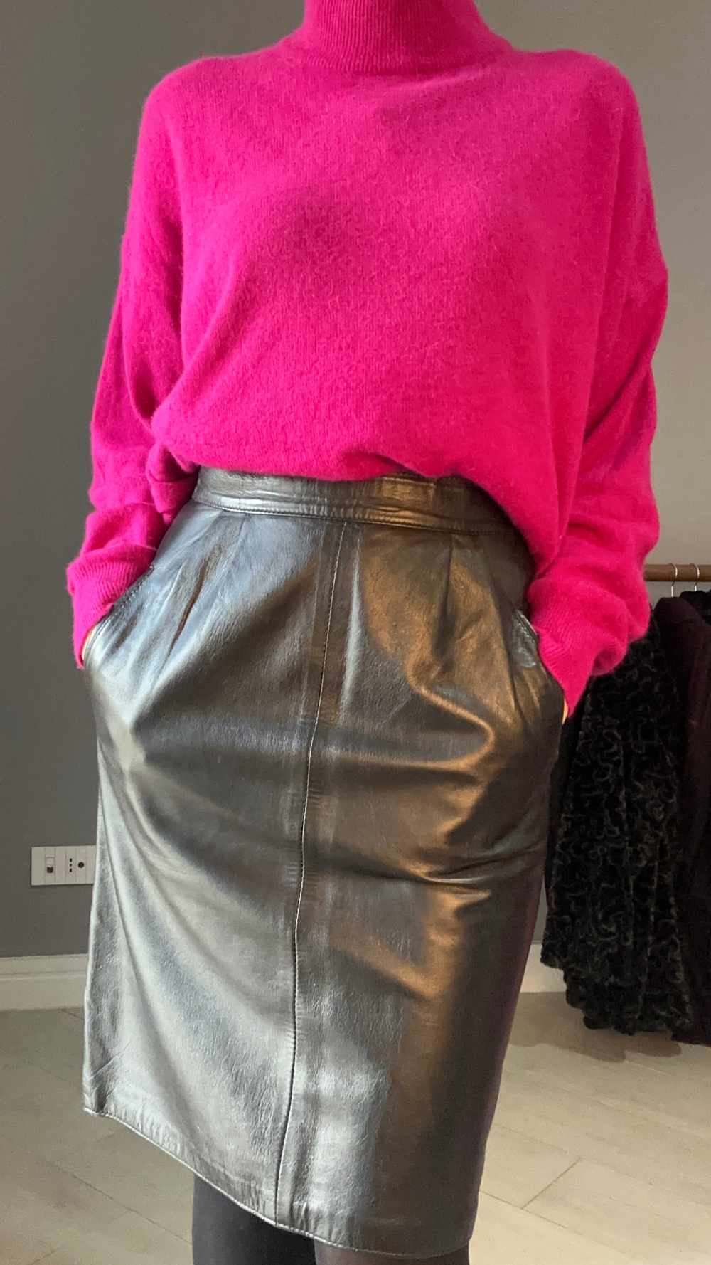 Gonna di pelle nera, fascia in vita, tasche davanti, chiusura sul retro con bottone a clip e cerniera, Pelle molto morbida. In perfette condizioni vintage, non presenta imperfezioni, veste al meglio una taglia 40-42 ma fai fede alle misure.