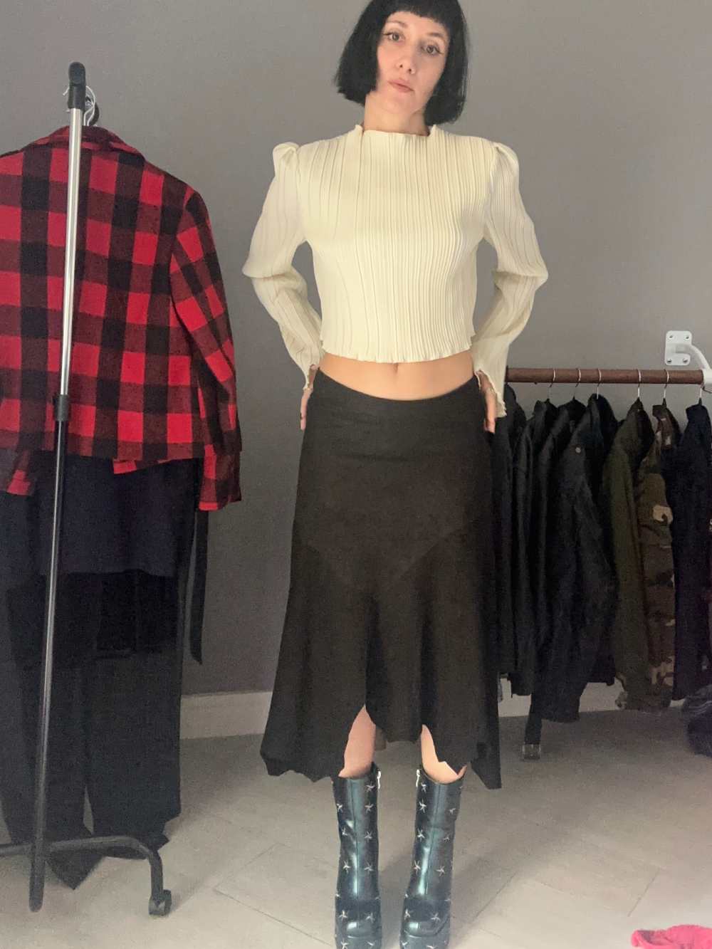Gonna in vera pelle scamosciata, nera con un bellissimo taglio e fit. Lunga sotto il ginocchio, totalmente asimmetrica e svasata sulla lunghezza. Anche in vita ha un effetto svasato e particolare, avendo una parte di tessuto che si alza formando una piccola collina che non si nota una volta indossata. Ha fodera interna. In perfette condizioni vintage, non presenta imperfezioni, veste al meglio una taglia 42 ma fai fede alle misure.