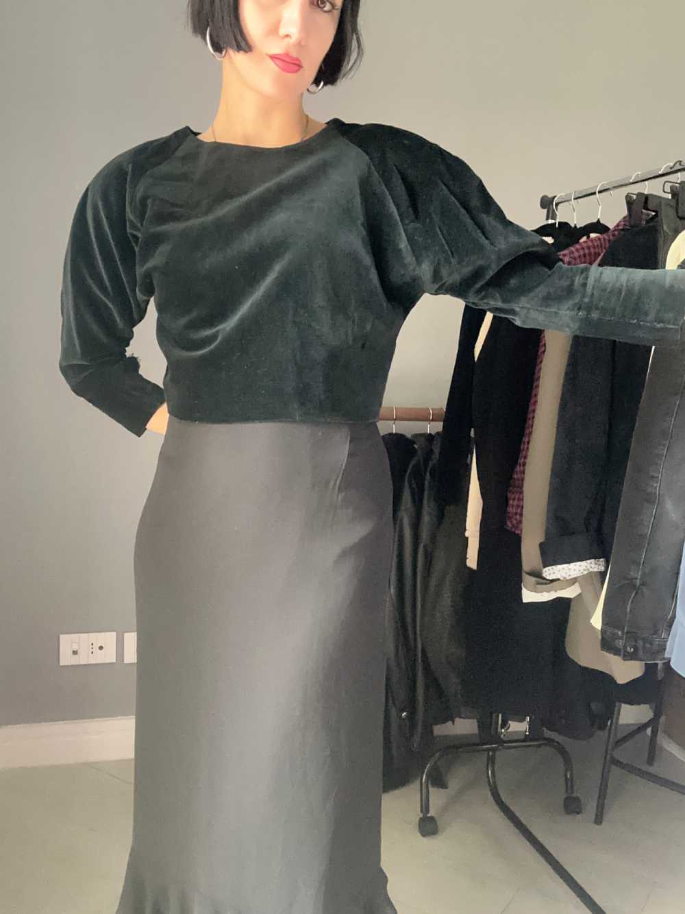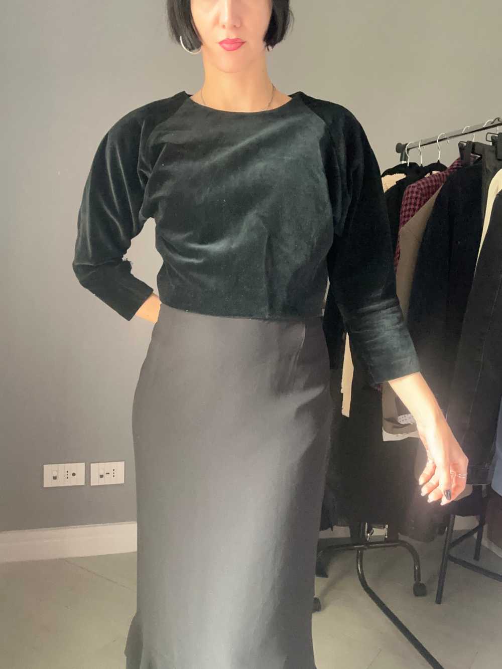 Maglia sartoriale in velluto, maniche a 3/4 e zip sul retro. Spalle raglan.