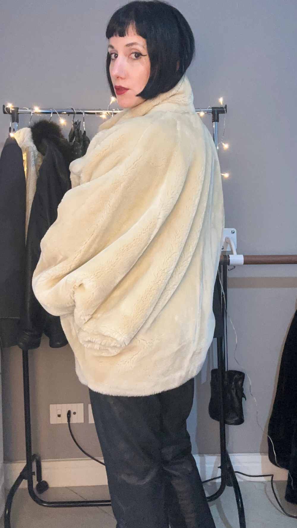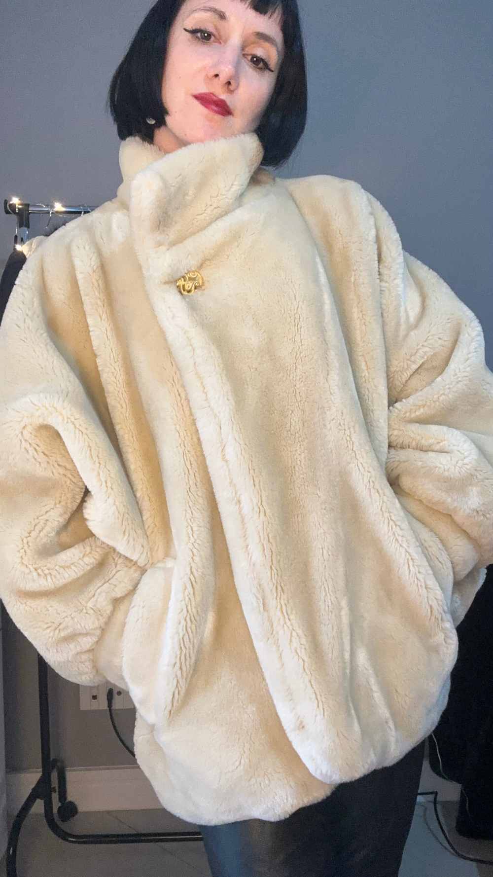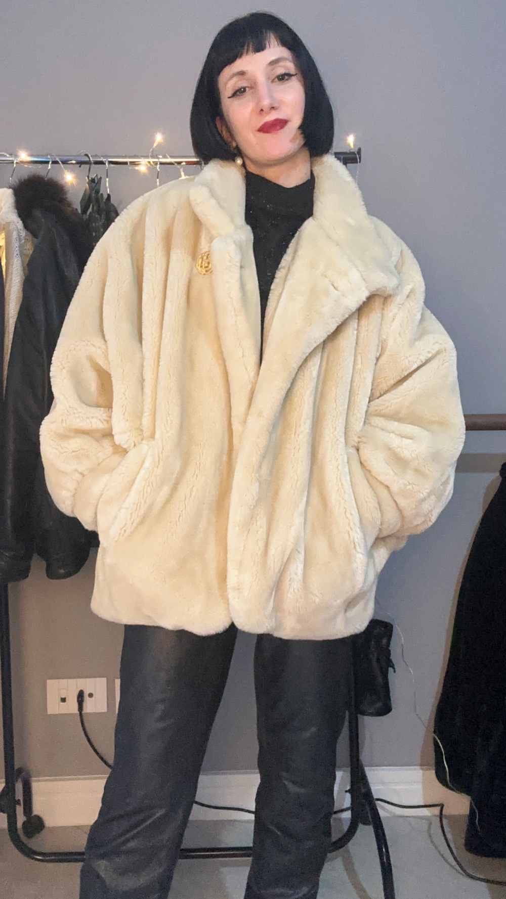 Pelliccia sintetica colore bianco panna. Tasche, colletto alzato, corta in vita. Ha un unico bottone grande posizionato al collo, color oro. Spalle raglan.