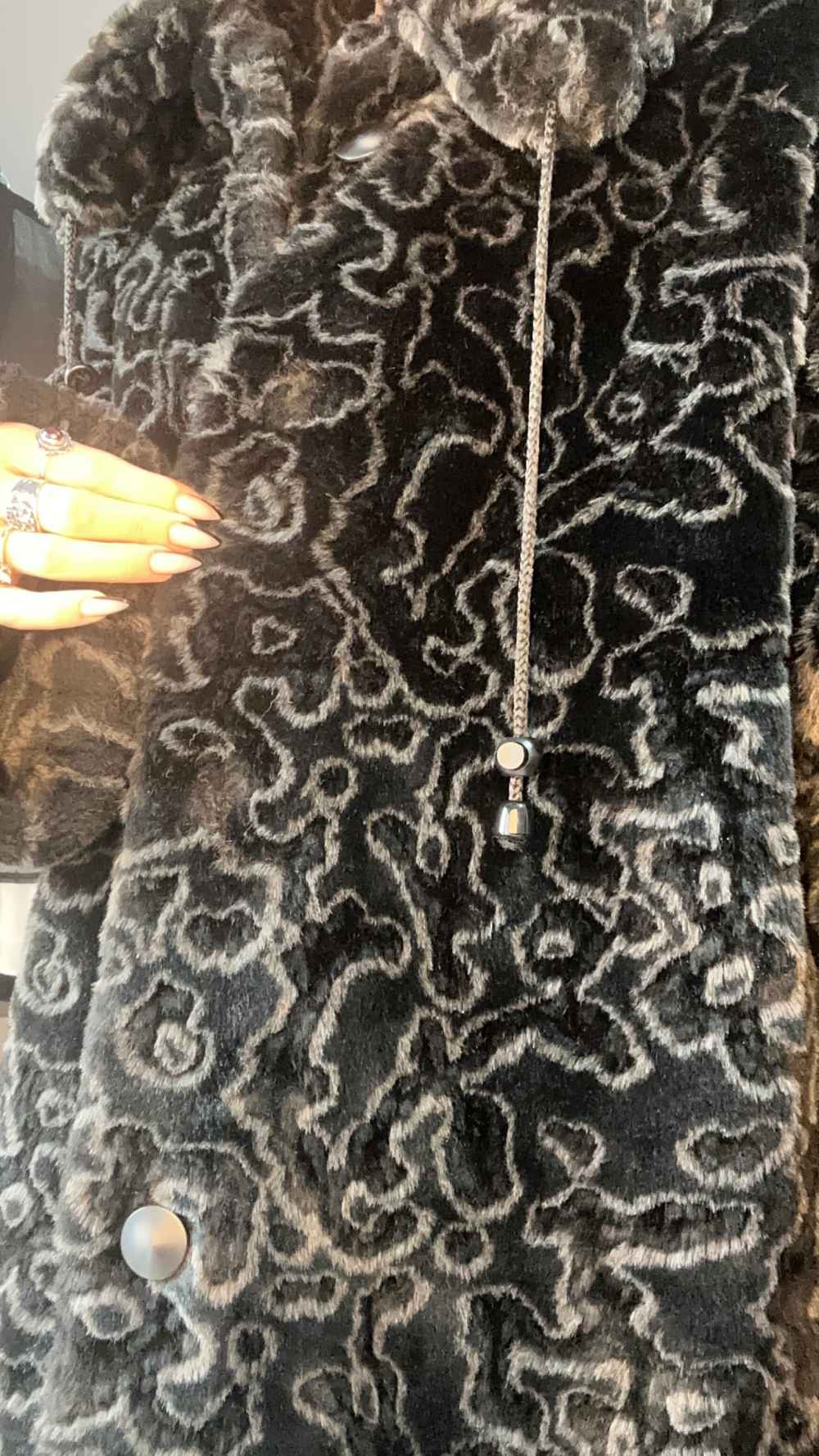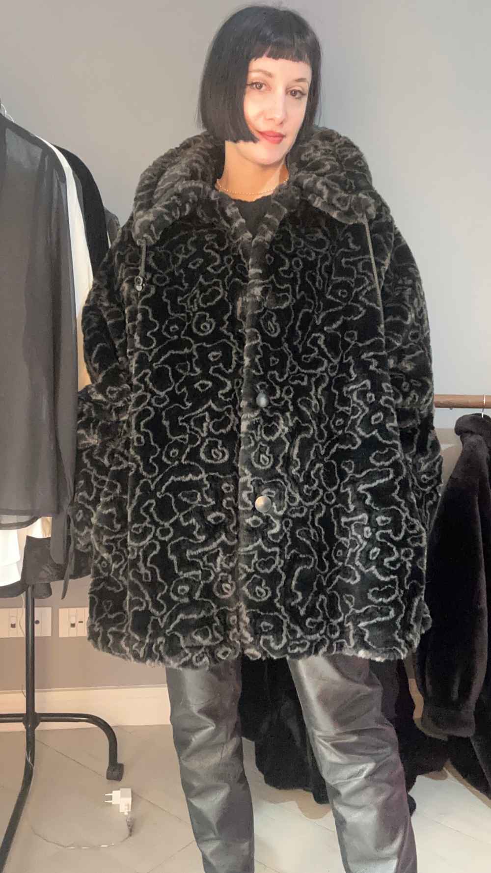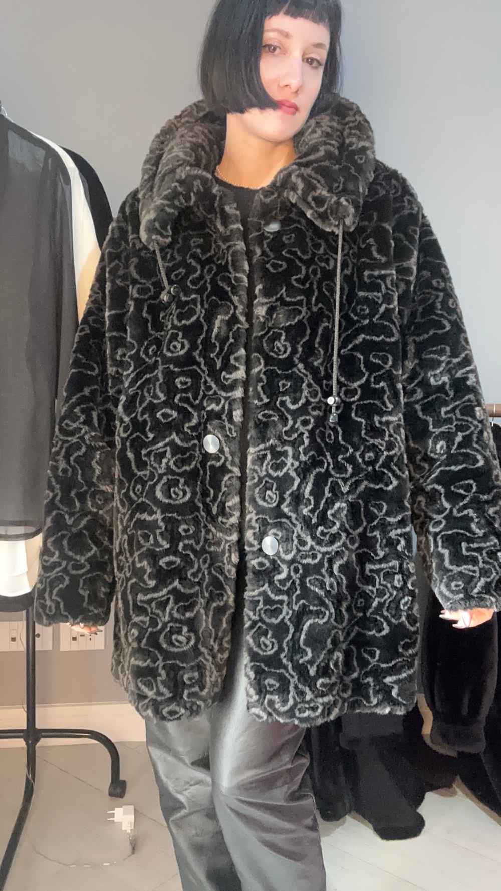 Bellissima e caldissima pelliccia sintetica colore nero, con decorazioni grigie. Bottoni sul davanti, collo alto, modello largo. Fit over.