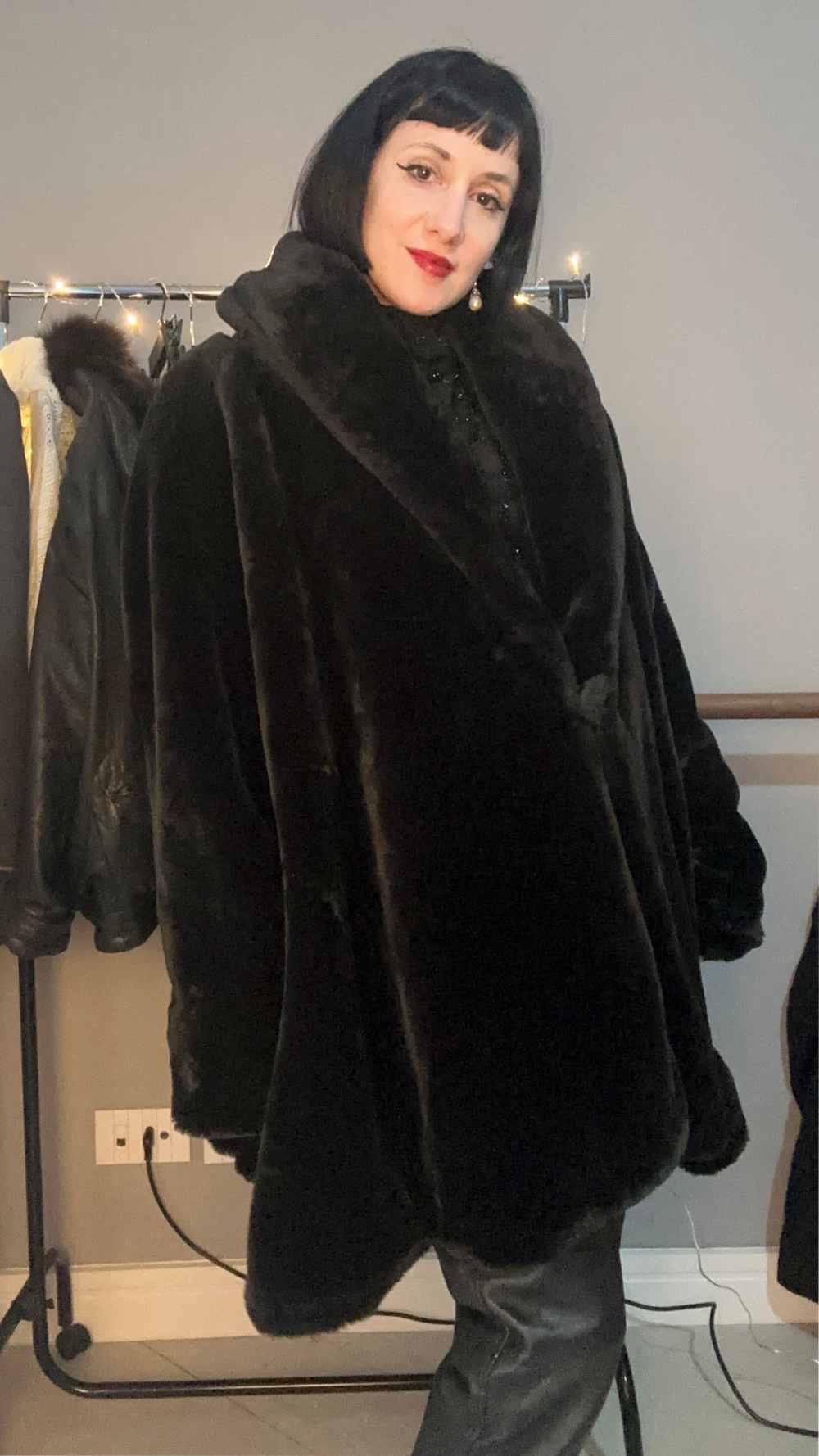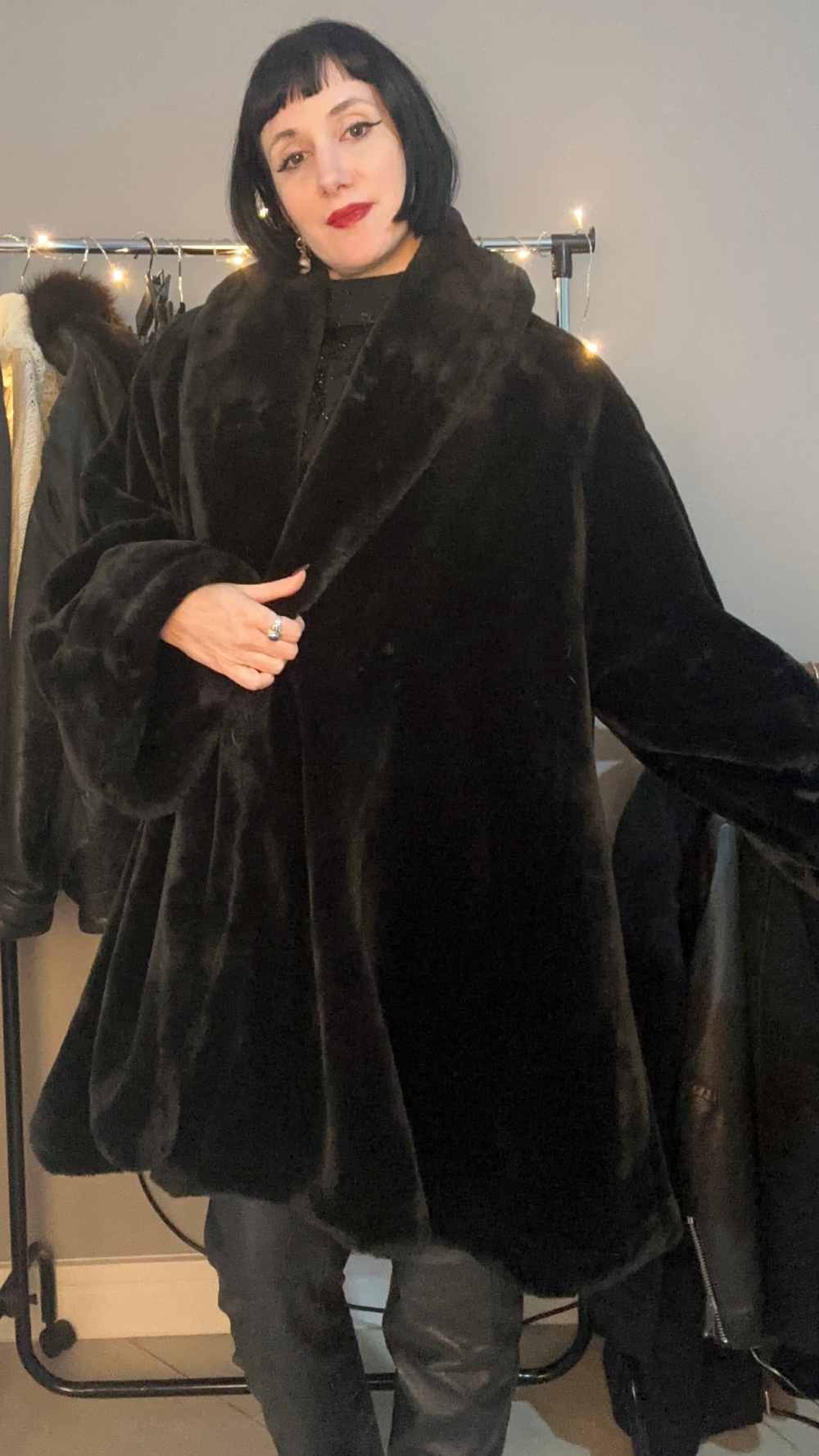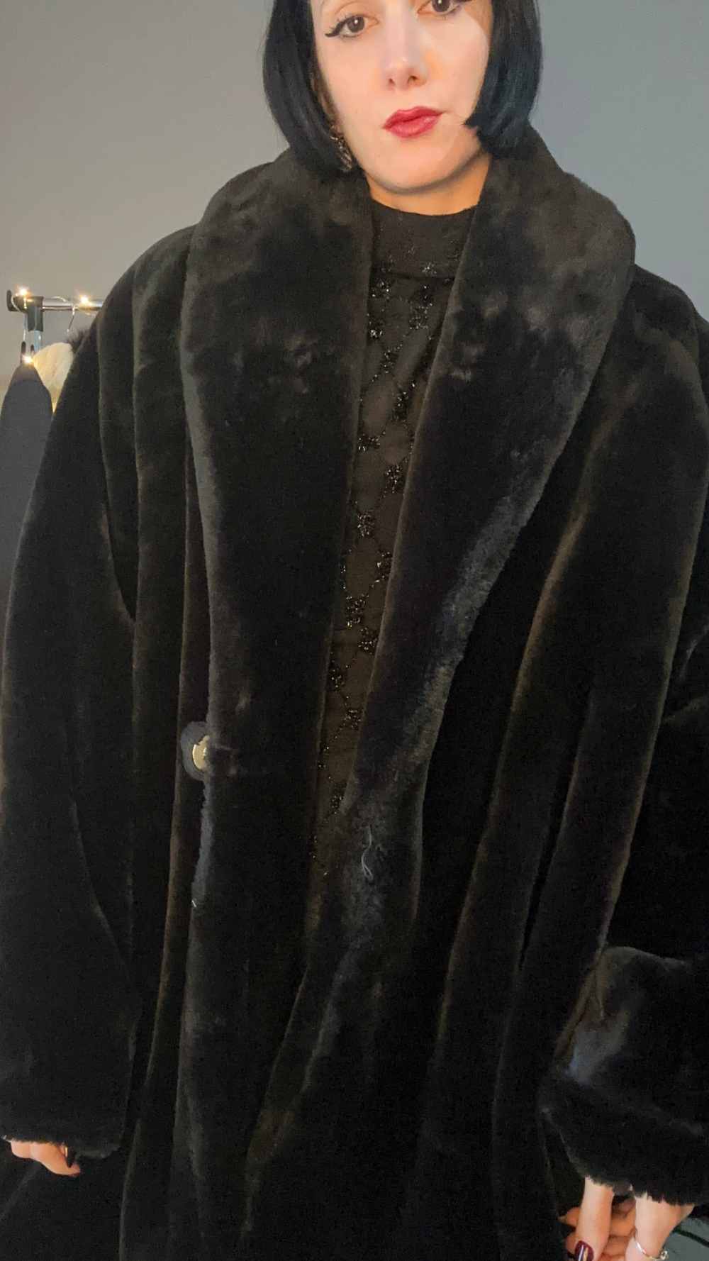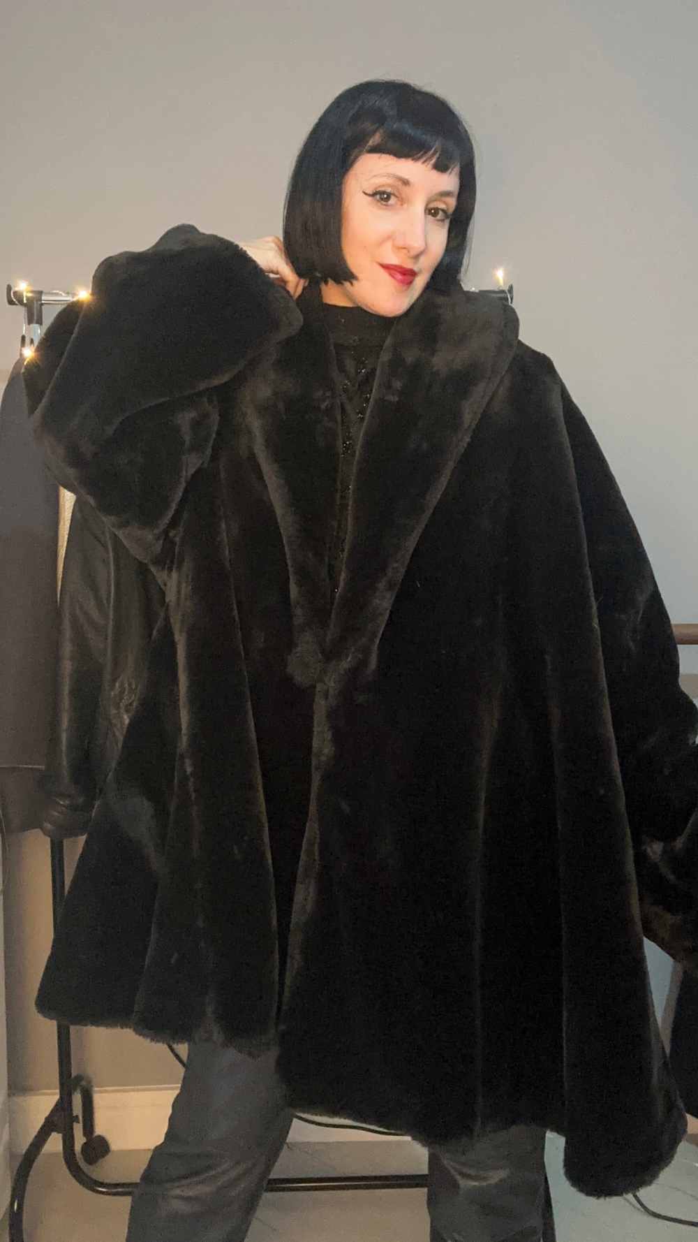 Pelliccia sintetica colore nero, anni '80, larga con bottone e collo con revers in pelliccia.
