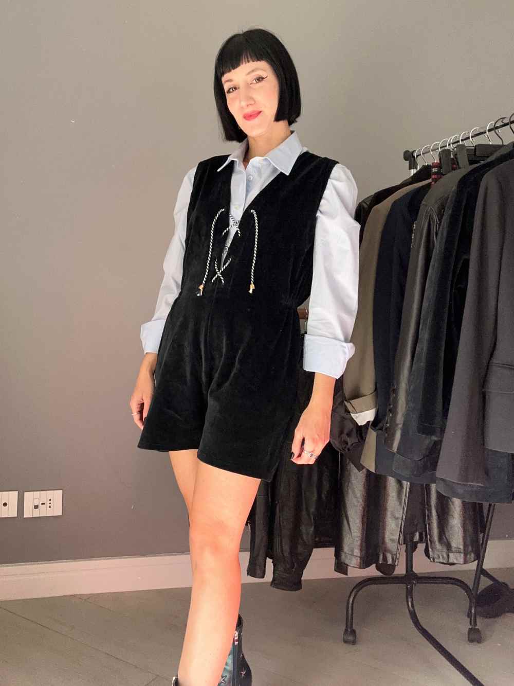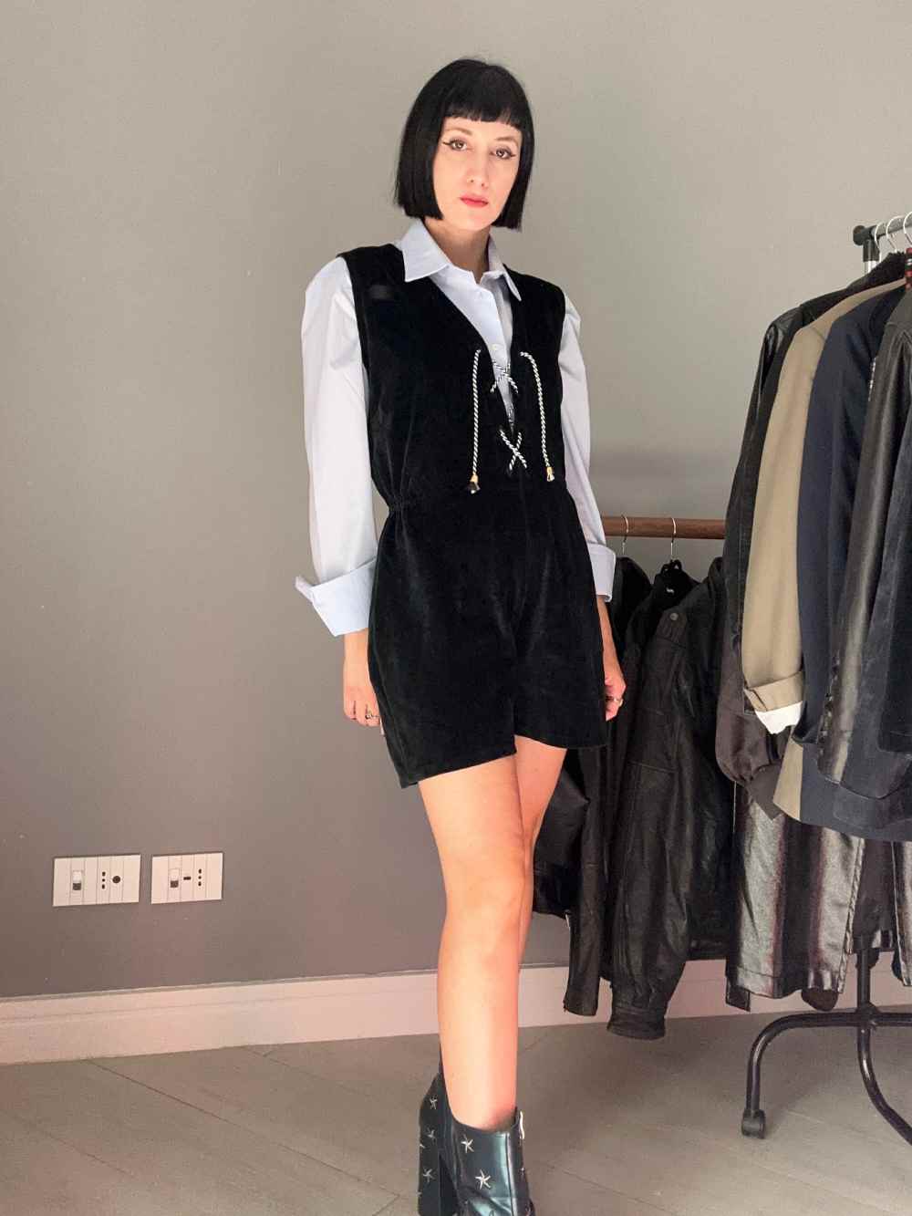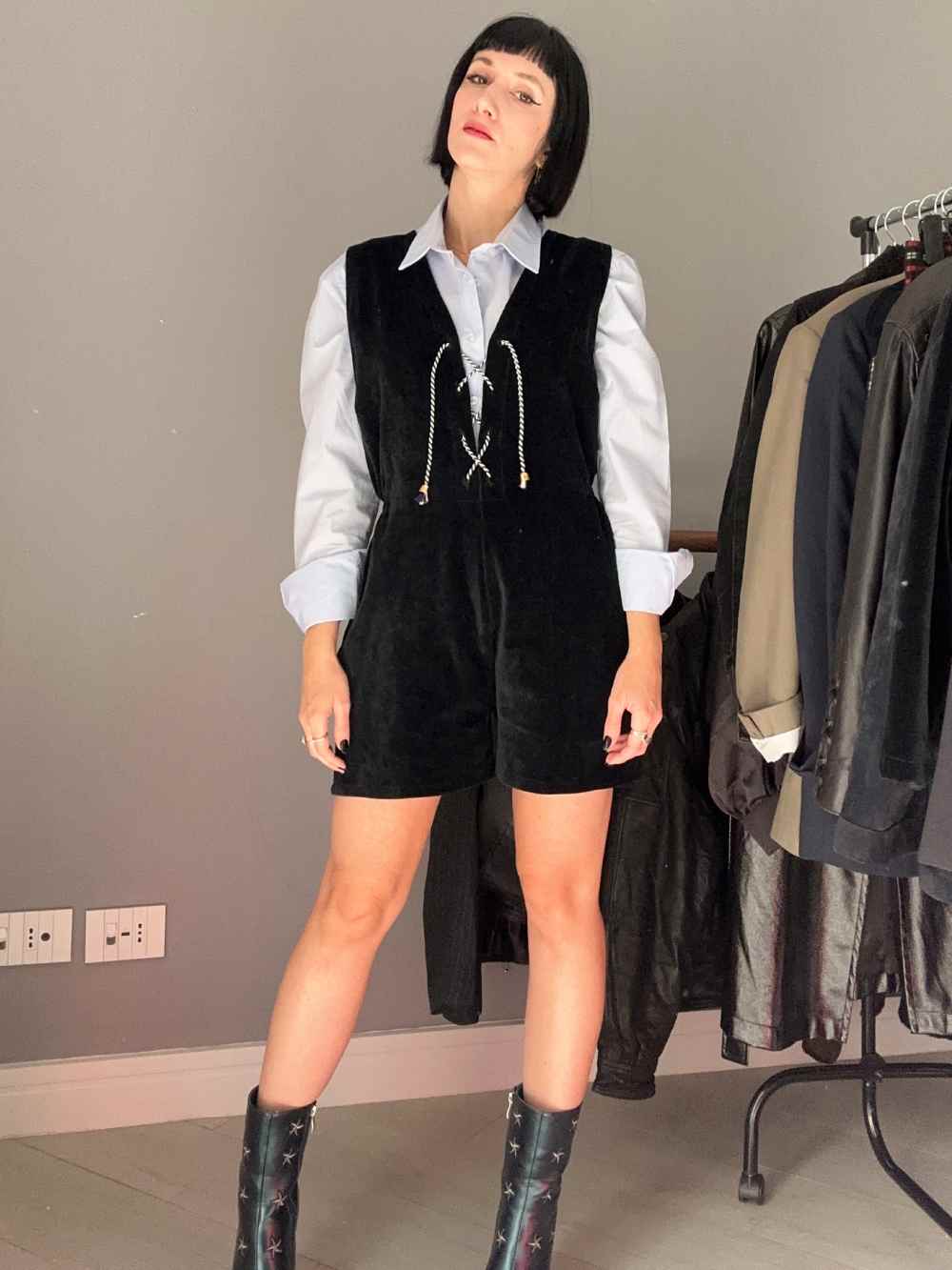 Bellissima tuta blu in velluto, manicata, a pantaloncino, con scollo pronunciato. Lo scollo si chiude con dei bellissimi laccetti bianchi e blu stile marinaio. Ha elastico in vita.